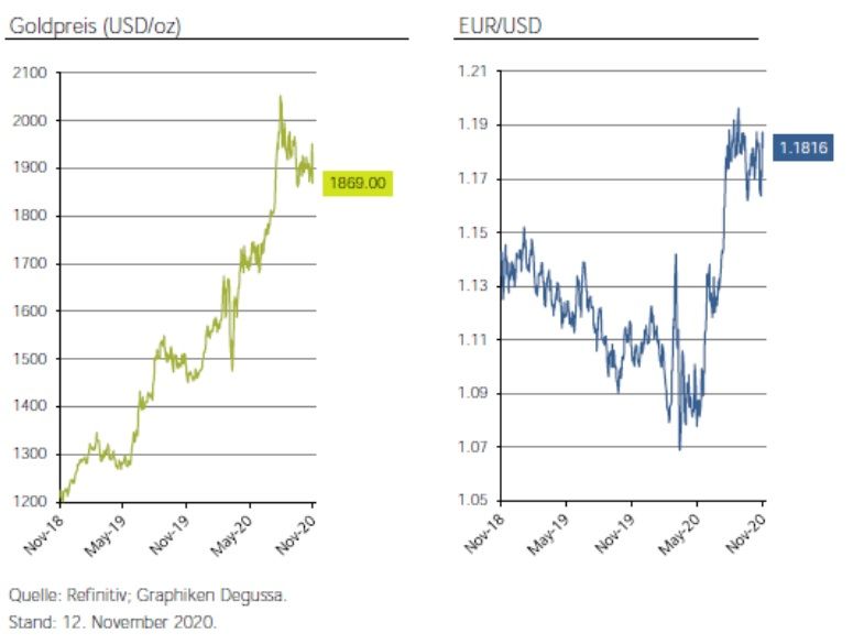 Seit dem 5. November 2020 hat der aktuelle Goldpreis (USD/oz) um ungefähr vier Prozent nachgegeben. Bei Silber sah es übrigens mit drei Prozent Einbruch ganz ähnlich aus.