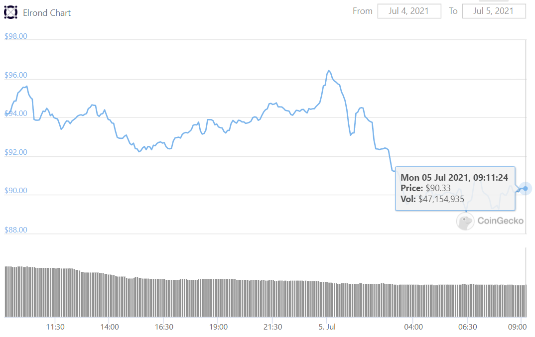 Bei Veröffentlichung dieses Artikels sank der EGLD Elrond’s native Token um vier Prozent. Zuvor wurde der EGLD für etwas mehr als 90 Dollar gehandelt.