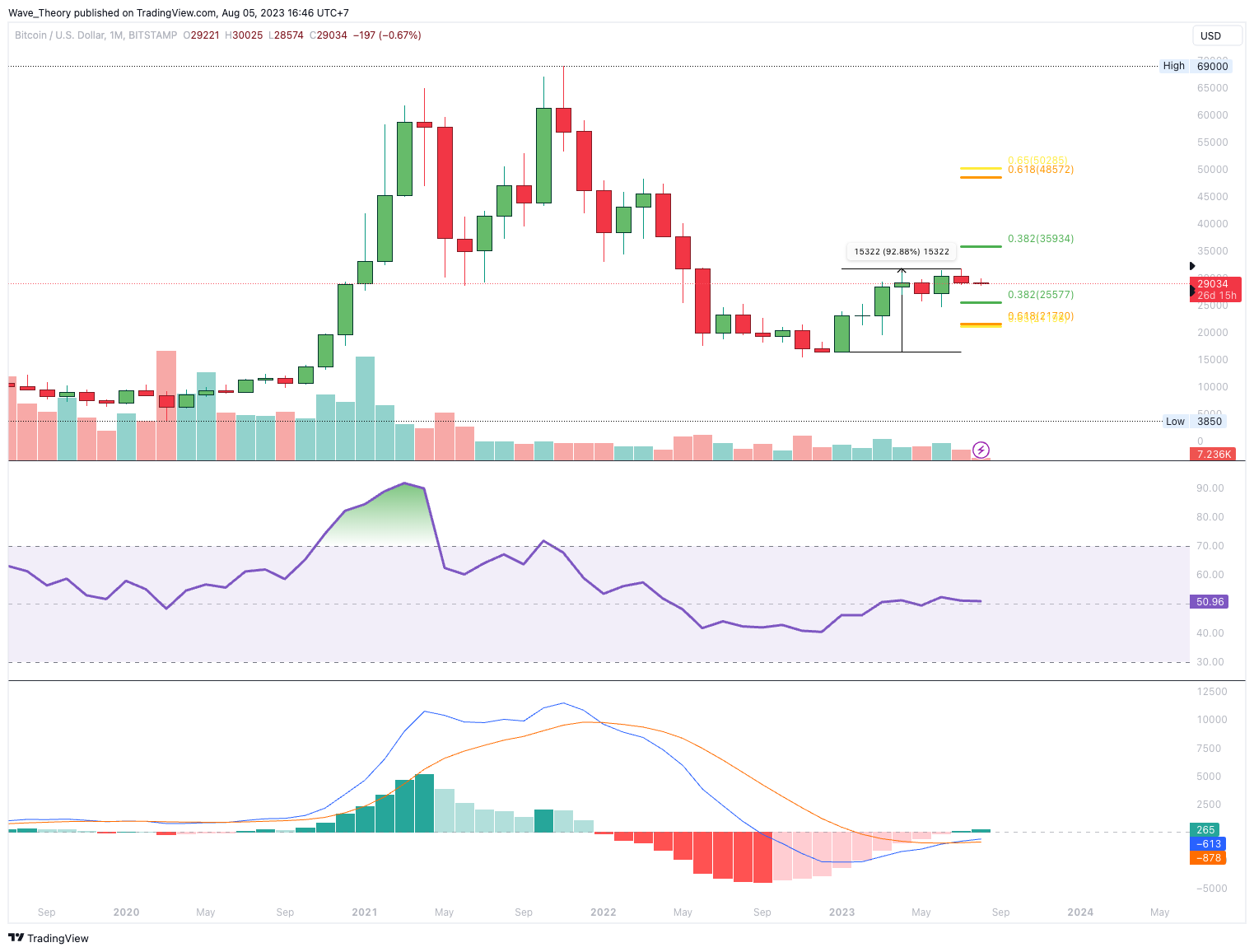 Solange sich Bitcoin über der Golden Ratio bei rund 21.200 USD hält, bleibt die Aufwärtsbewegung bullisch intakt. Im überliegenden Trend ist Bitcoin aber immer noch bärisch, denn für einen neuen Bullenzyklus muss Bitcoin die Fib Widerstände bei rund 36.000 USD und 50.000 USD überwinden.