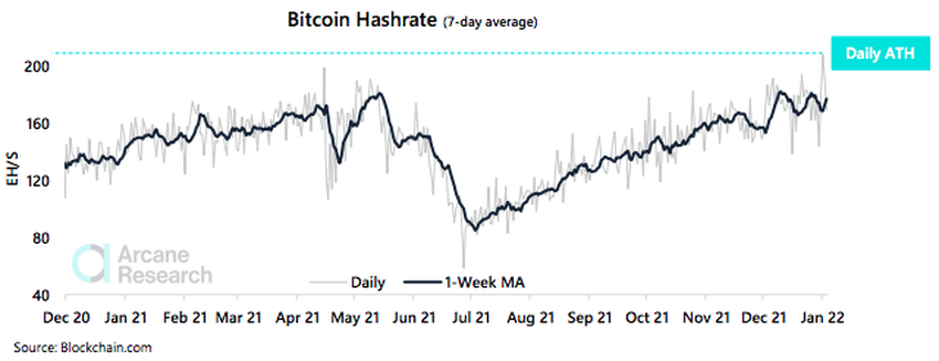 Ein weiterer Trend zeigt sich an der Bitcoin Hashrate. Aus einem Bericht von Arcane Research geht hervor, dass die Hash-Rate weiter steigen wird. Denn Mining-Unternehmen investieren Millionen in neues Mining-Equipment. Die folgende Grafik zeigt den Trend der Bitcoin-Hashrate von Dezember 2020 bis Anfang Januar 2022: