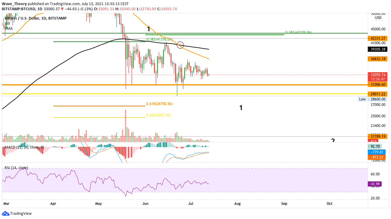 Aus technischer Sicht bleibt alles unter 52.000 USD bärisch. Das obere Ende einer Aufwärtsbewegung in diesem Bärentrend wird von dem Fibonacci Niveau bei 43.000 USD begrenzt. Zwar zeichnet sich eine leichte bullische Divergenz im Tageskurs ab, woraufhin der Bitcoin Kurs erneut von der 30.000 USD Marke in Richtung 40.000 USD steigen könnte, jedoch gibt es eine Reihe an bärischen Argumenten, welche den Trend mittelfristig eher tiefer bringen könnten. Man sollte die Möglichkeit eines Rückgangs auf 25.000 USD oder gar 20.000 USD also nicht vernachlässigen. Das Death Cross im Tageskurs markiert in der Regel einen länger anhaltenden Bärentrend.