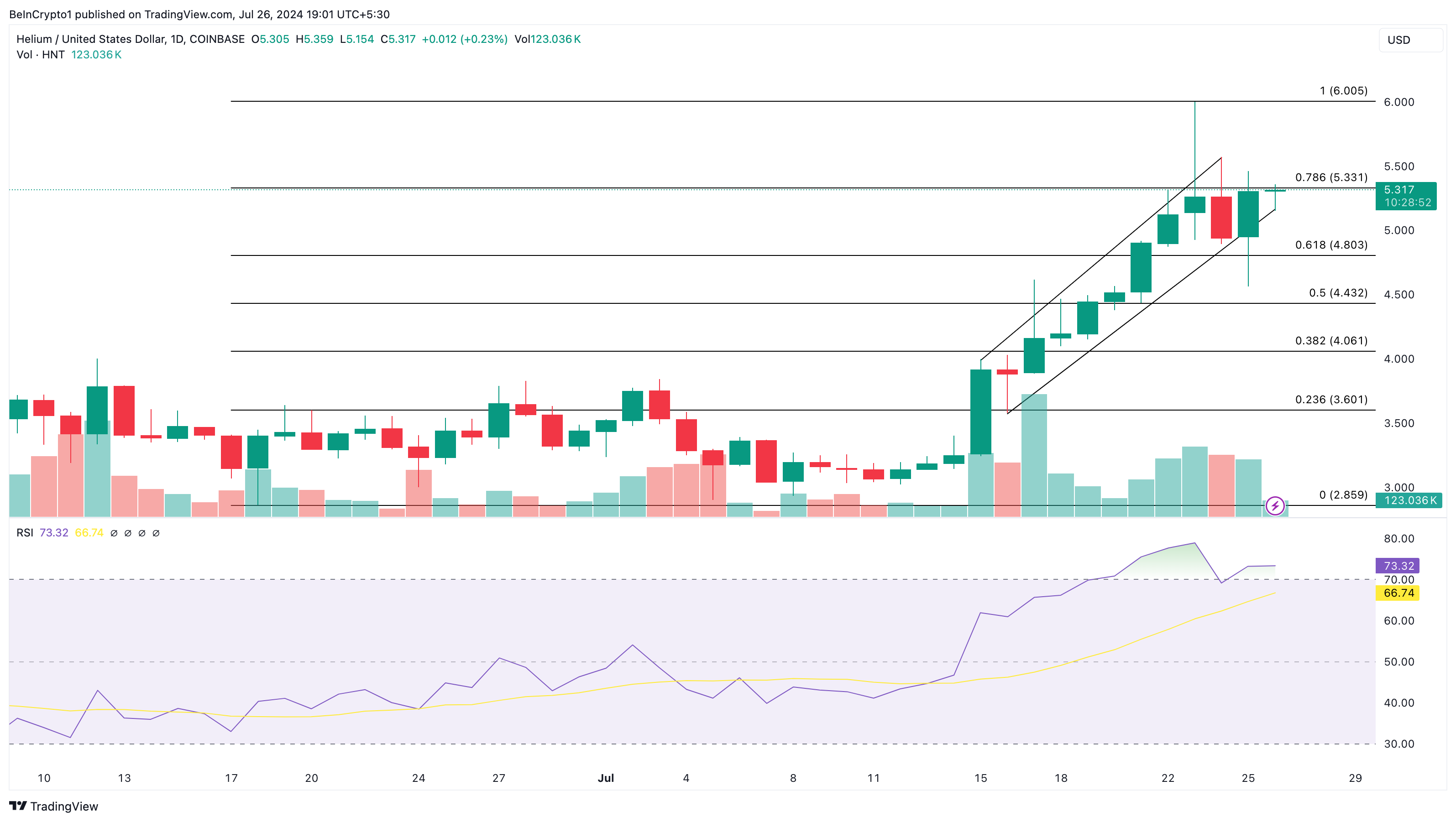 Aktuell handelt HNT zu 5,30 USD nach einem Anstieg von 23,76 Prozent in den letzten sieben Tagen. Laut dem Tageschart erlebte HNT am 16. Juli einen Rückgang, als der Kurs auf 3,57 USD fiel. Dies war der Beginn des Aufwärtstrends, der den Kurs später auf 6 USD steigen ließ.