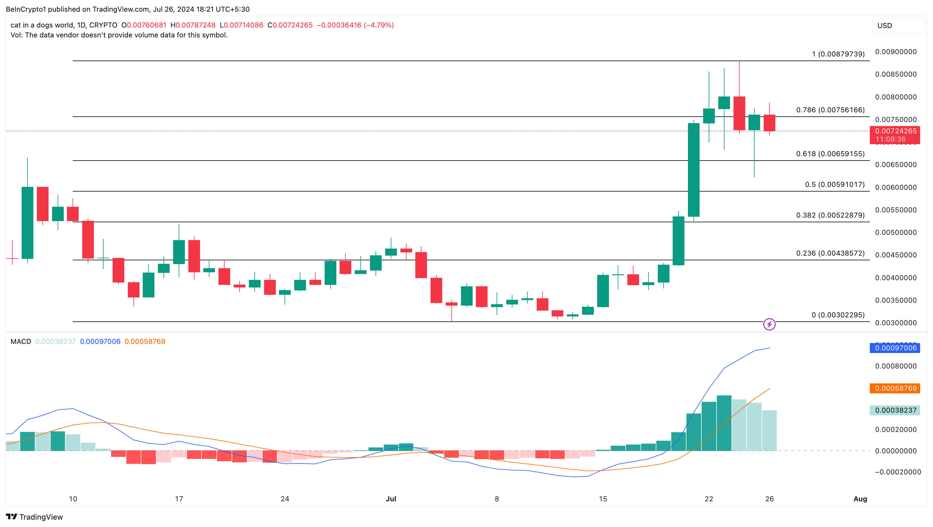 Wie die obige Grafik zeigt, ist der MACD auf dem Tages-Chart positiv. Daher könnte der Wert der Kryptowährung auf 0,0087 USD steigen, wenn der Kaufdruck zurückkehrt. Sollten die Gewinnmitnahmen jedoch zunehmen, könnte die bullische Prognose hinfällig werden und MEW auf 0,0065 USD fallen.