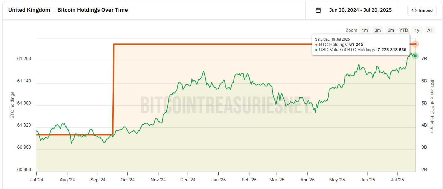 Laut Bitcoin Treasuries-Daten hält das Vereinigte Königreich derzeit 61.245 BTC, die etwa 7,2 Mrd. USD wert sind. Die meisten dieser BTC wurden 2024 beschlagnahmt, als ihr geschätzter Wert etwa 1,4 Mrd. GBP betrug.