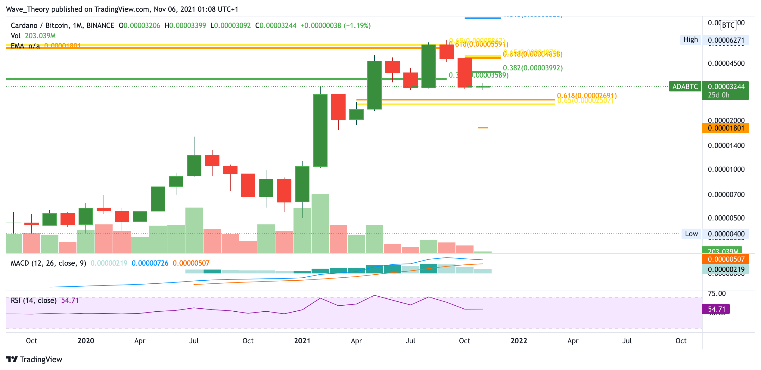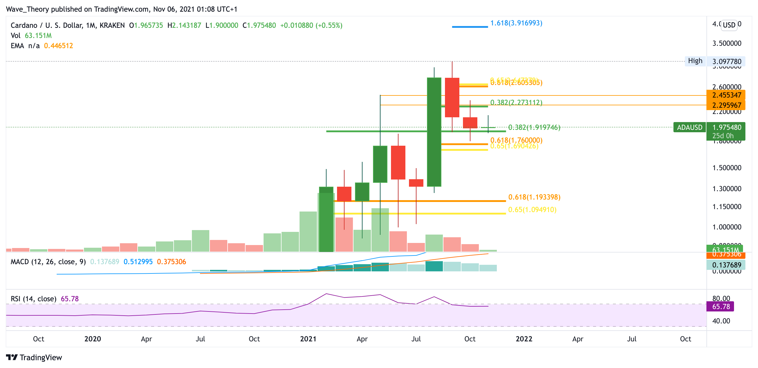 Der Monatsschluss des Oktobers fiel tatsächlich gut für ADA aus. Zwar war der Oktober durch und durch ein bärischer Monat für Cardano, jedoch konnte der ADA Kurs über dem 0,382 Fib Niveau bei rund 1,9 USD schließen. Dies gibt Grund zur Annahme, dass diese Unterstützung halten könnte und ein grüner, bullischer Monat bevorsteht. Der Trend von Cardano ist aber erst dann wieder bullisch, wenn die Golden Ratio bei 2,6 USD gebrochen wird. Dann könnte der ADA Kurs bis zum Allzeithoch bei rund 3,1 USD, oder gar bis zum nächsten Fibonacci Niveau bei rund 3,9 USD steigen.