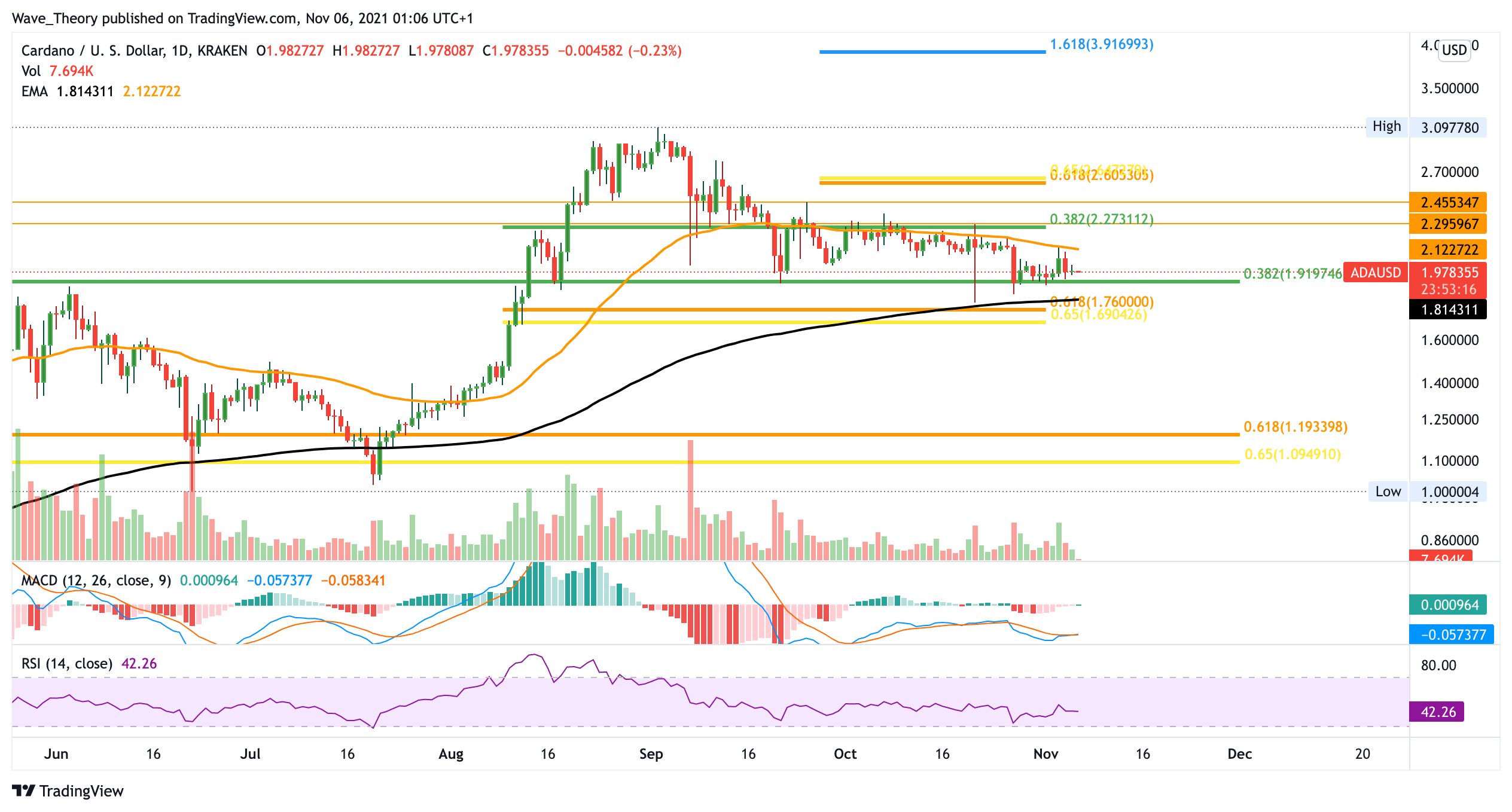 Denn dort befindet sich der Cardano Kurs seit Ende August in einem Abwärtstrend. Nun befindet sich der Cardano Kurs jedoch an einer 0,382 Fib Unterstützung bei 1,91 USD und etwas tiefer, bei rund 1,75 USD stößt er zudem auf wichtige Golden Ratio Unterstützung, welche durch den 200-Tage-EMA gekreuzt wird. An diesem Preisniveau könnte der ADA Kurs sehr wohl stark abprallen, um bis 2,27 USD oder gar 2,6 USD zu steigen. Der MACD entwickelt sich Tageskurs bereits wieder bullisch, was eine baldige Aufwärtsbewegung nahelegt. Aktuell hat der ADA Preis also gute Chancen, in naher Zukunft eine Aufwärtsbewegung zu sehen.