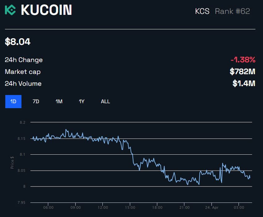 Der Preis des nativen KuCoin Tokens KCS reagierte nicht auf den Hack des Twitter-Kontos. Zum Zeitpunkt der Erstellung des Artikels verzeichnet der KCS Kurs ein Tagesminus von 1,4 % und pendelte etwas über der 8 US-Dollar-Marke.