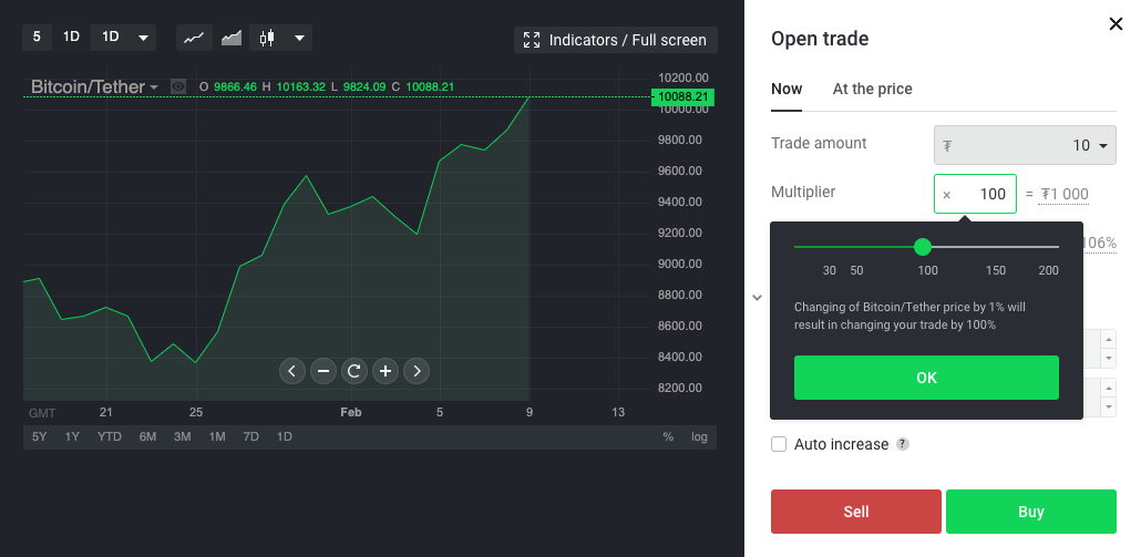 Infolgedessen ist es durch den Handel mit einem 200-fachen Hebel möglich, eine Position von 2,45 BTC mit nur 0,01225 BTC – rund €119 – zu eröffnen. Dank der Vorteile des Hebeleffekts wird sich der Wert dieser Position mit der 200-fachen Änderungsrate des Bitcoin-Marktes multiplizieren. Dies bedeutet, dass eine positive Preisbewegung von 5% einen Gewinn von 1.000% ergibt, während eine positive Preisbewegung von einem Prozent einen Gewinn von 200% ergeben würde.