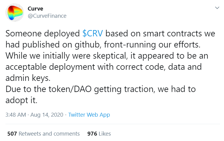 Curve ist eine dezentrale Börse speziell für den Handel mit Stablecoins. Um die Community dazu anzuregen, der Börse Liquidität bereitzustellen, wollte Curve ebenfalls einen Governance-Token ins Leben rufen und an ihre Benutzer verteilen. Ihnen kam allerdings ein unbekannter Nutzer zuvor und pushte den bereits veröffentlichten Smart Contract für den CRV-Token auf die Ethereum-Blockchain.
