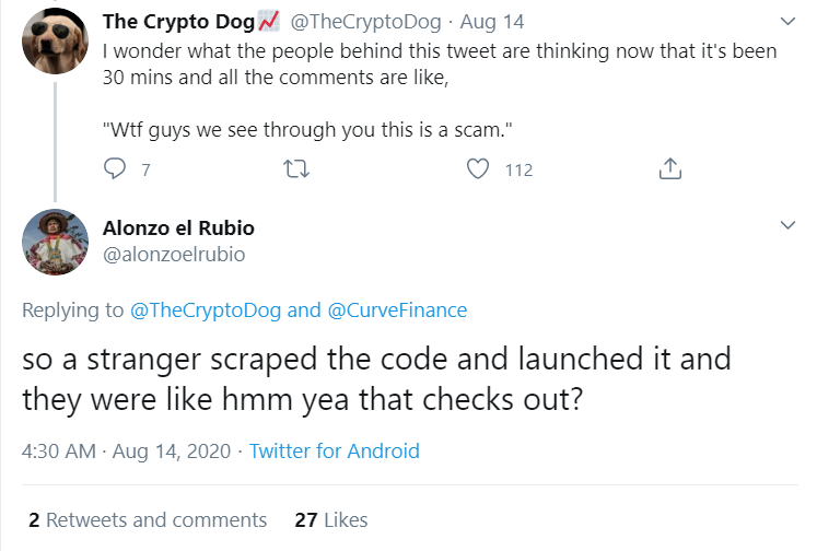 Da der Token dadurch in Umlauf geriet und bereits auf einigen dezentralen Börsen öffentlich gehandelt wurde, entschied sich Curve kurzerhand, diesen inoffiziellen Token weiter zu verwenden. Laut der Plattform soll der Smart Contract korrekt und sicher sein. Die Twitter-Community spekuliert, ob es sich dabei um eine Betrugsmasche, oder womöglich um einen Inside-Job handelt, mit dem sich die Initiatoren von Curve gegenüber rechtlicher Haftung für den Token und ihre Plattform absichern wollen.