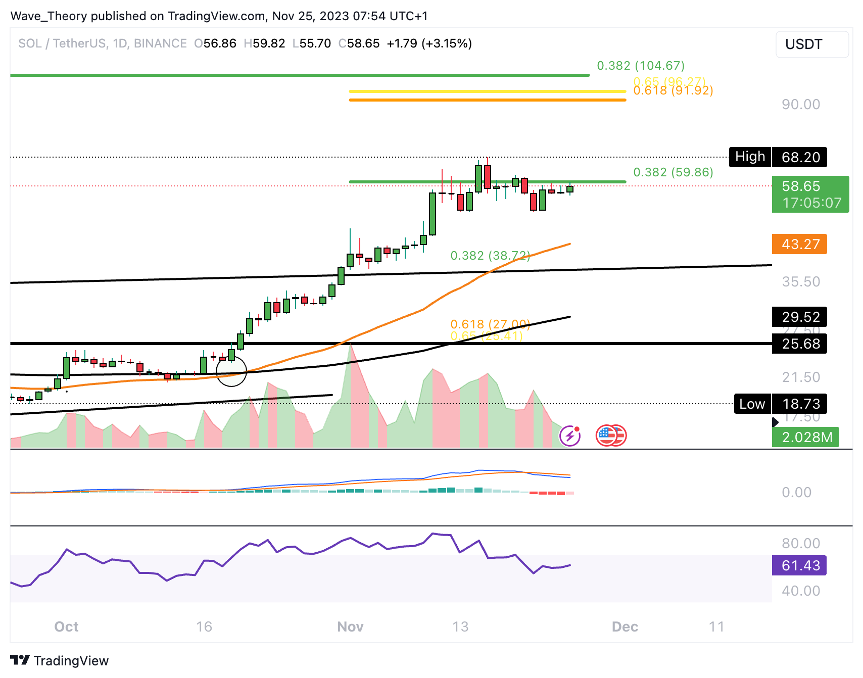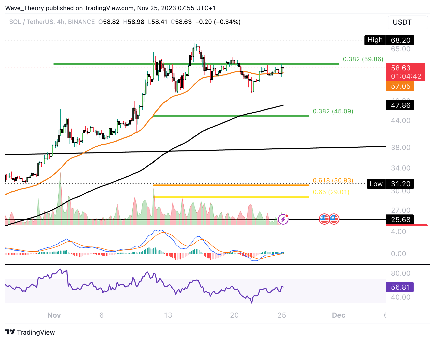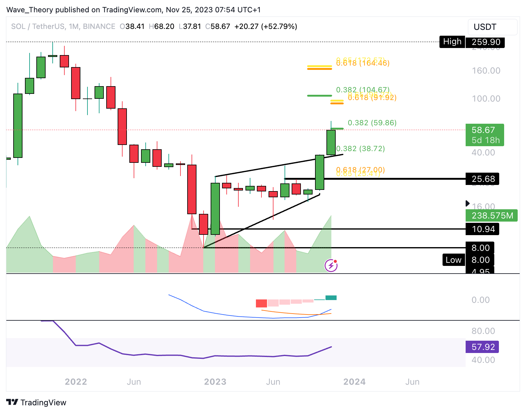 Schließt der Solana Kurs in diesem Monat unter dem 0,382 Fib Niveau bei rund 60 USD?