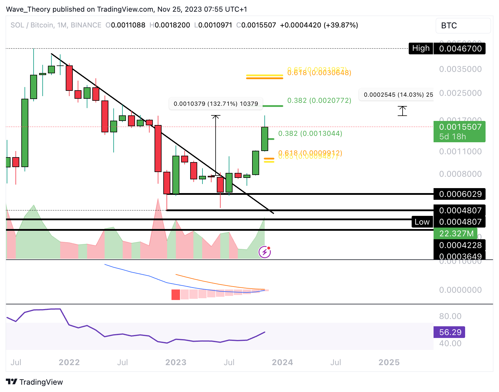 Doch aktuell geht es wieder bergab für den SOL Kurs. Damit warten bei rund 0,0013 BTC und bei rund 0,00099 BTC die nächsten signifikanten Fib Unterstützungen.