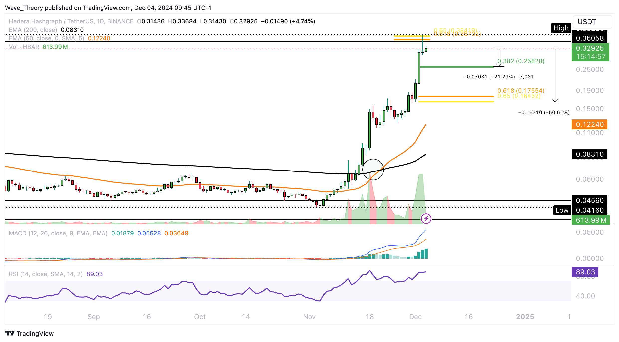 Seit Beginn des letzten Monats hat sich der Hedera Hashgraph Kurs um rund 483 % gesteigert. Damit hat HBAR jetzt signifikanten Fibonacci Widerstand an der Golden Ratio bei rund 0,37 USD erreicht.