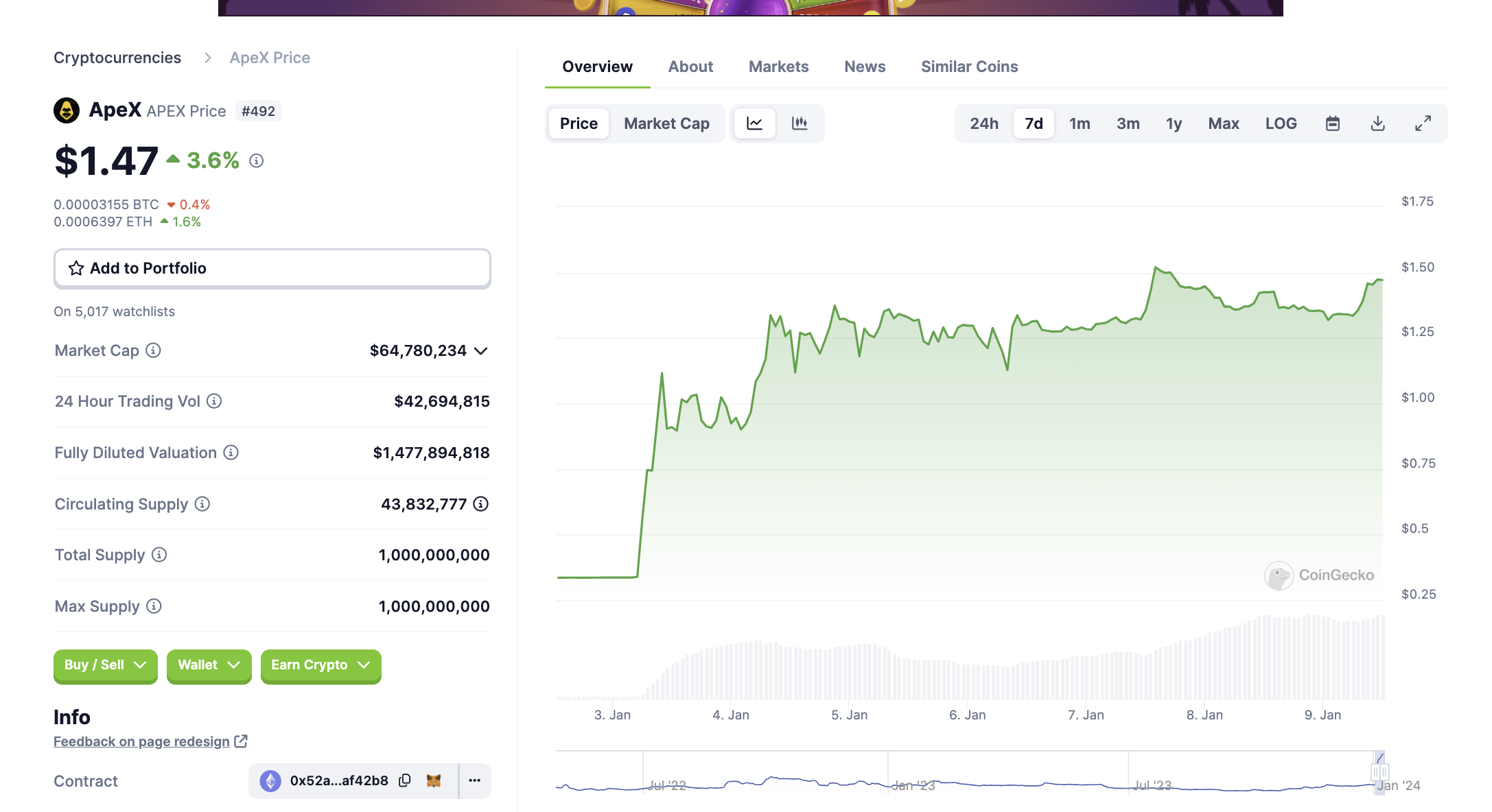 Es handelt sich dabei um einen kleinen Coin, der nicht auf vielen Börsen gelistet ist. Der Coin ApeX (APEX) weist derzeit eine Marktkapitalisierung von rund 64 Millionen USD auf.