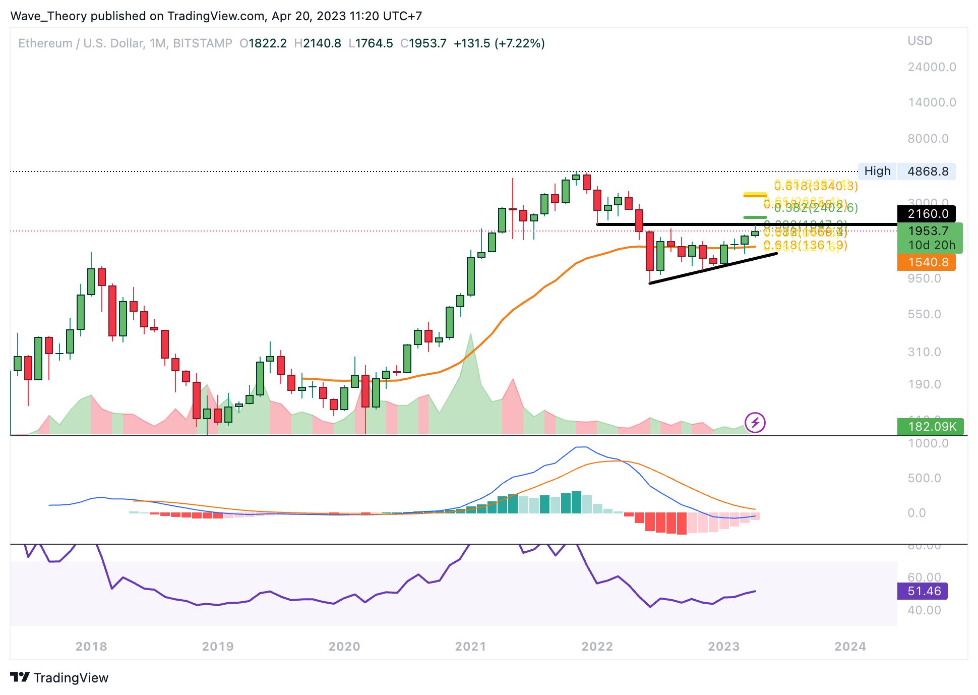 Im Wochenchart wird ersichtlich, dass sich bei rund 2.160 USD der Tiefpunkt aus dem Jahr 2022 befindet, nachdem Ethereum seinen Bullenlauf zum ATH bei rund 4.870 USD hinter sich hatte. Dieses Preisniveau fungiert als signifikanter Widerstand, welches es zu brechen gilt, sofern ETH zu den nächsten Fib Widerständen zwischen rund 2.400 USD und rund 2.600 USD stiegen möchte.