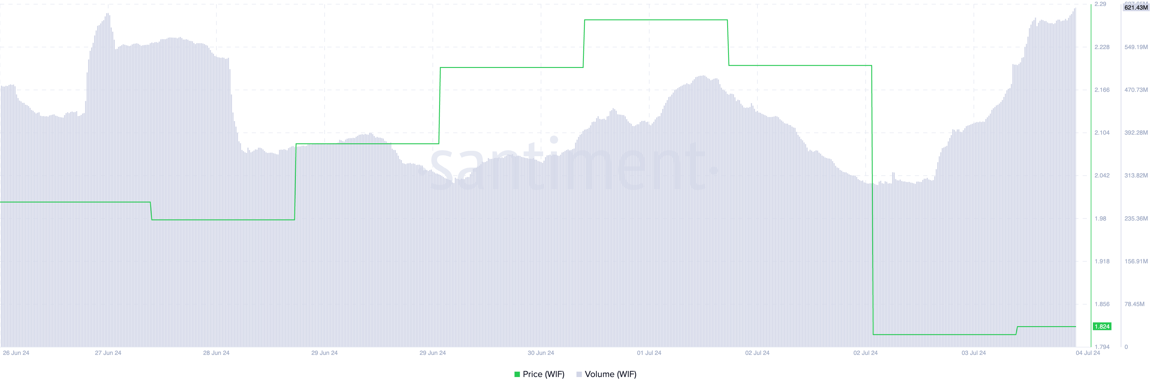Trotz des Rückgangs des WIF-Kurses in den letzten 24 Stunden ist sein Handelsvolumen gestiegen. Es beläuft sich derzeit auf 621 Millionen USD und ist im betrachteten Zeitraum um 101 Prozent gestiegen.