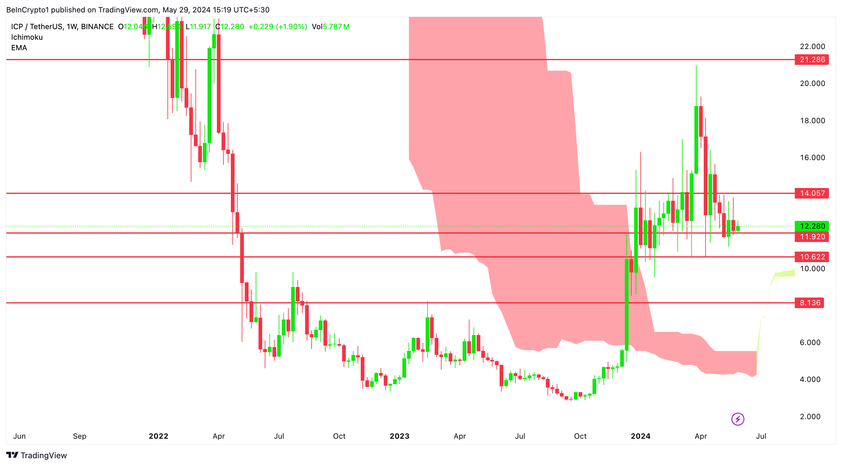 Der ICP/USDT-Markt ist konsolidiert und handelt innerhalb eines kritischen Bereichs, der durch wichtige Unterstützungs- und Widerstandsniveaus definiert ist. Ein Ausbruch über 14 USD, der das 1-Tages-Basisplateau und die Wolke überschreitet, könnte höhere Widerstandsniveaus erneut testen. Das erste Ziel liegt dabei bei 15,76 USD.