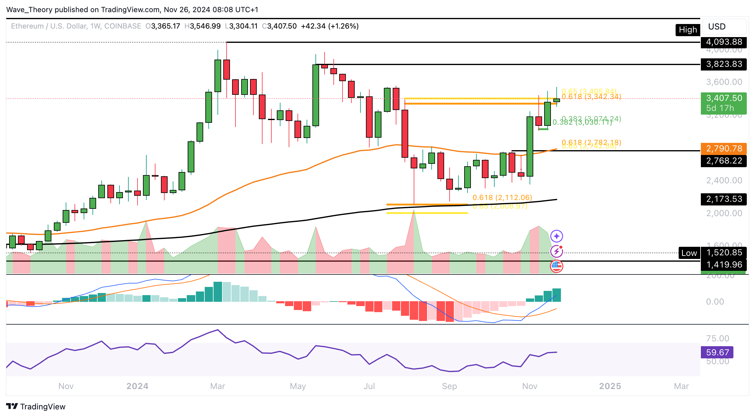 SponsoredSollte Ethereum die Golden Ratio bei rund 3.400 USD überwinden, könnte er zum Widerstandsbereich zwischen rund 3.824 USD und 3.094 USD steigen.