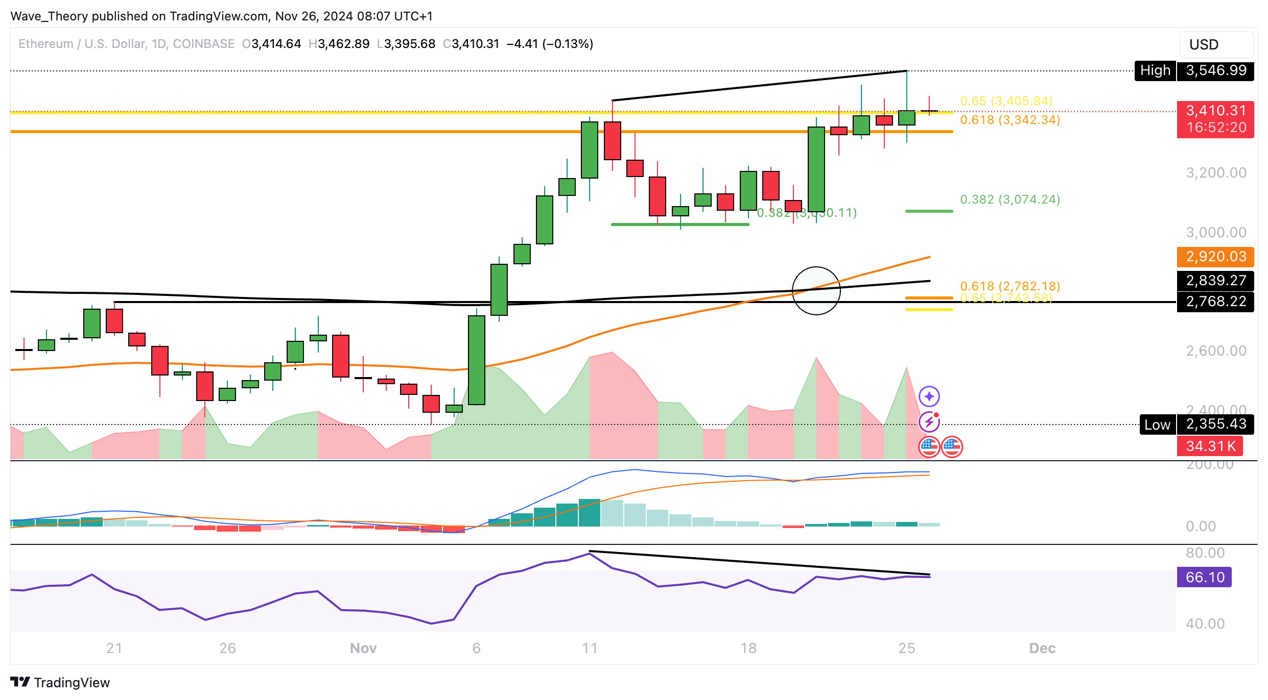 Damit befindet sich Ethereum jetzt erneut am Golden Ratio Widerstand bei rund 3.400 USD. Zeitgleich zeichnet sich eine bärische Divergenz im RSI ab.