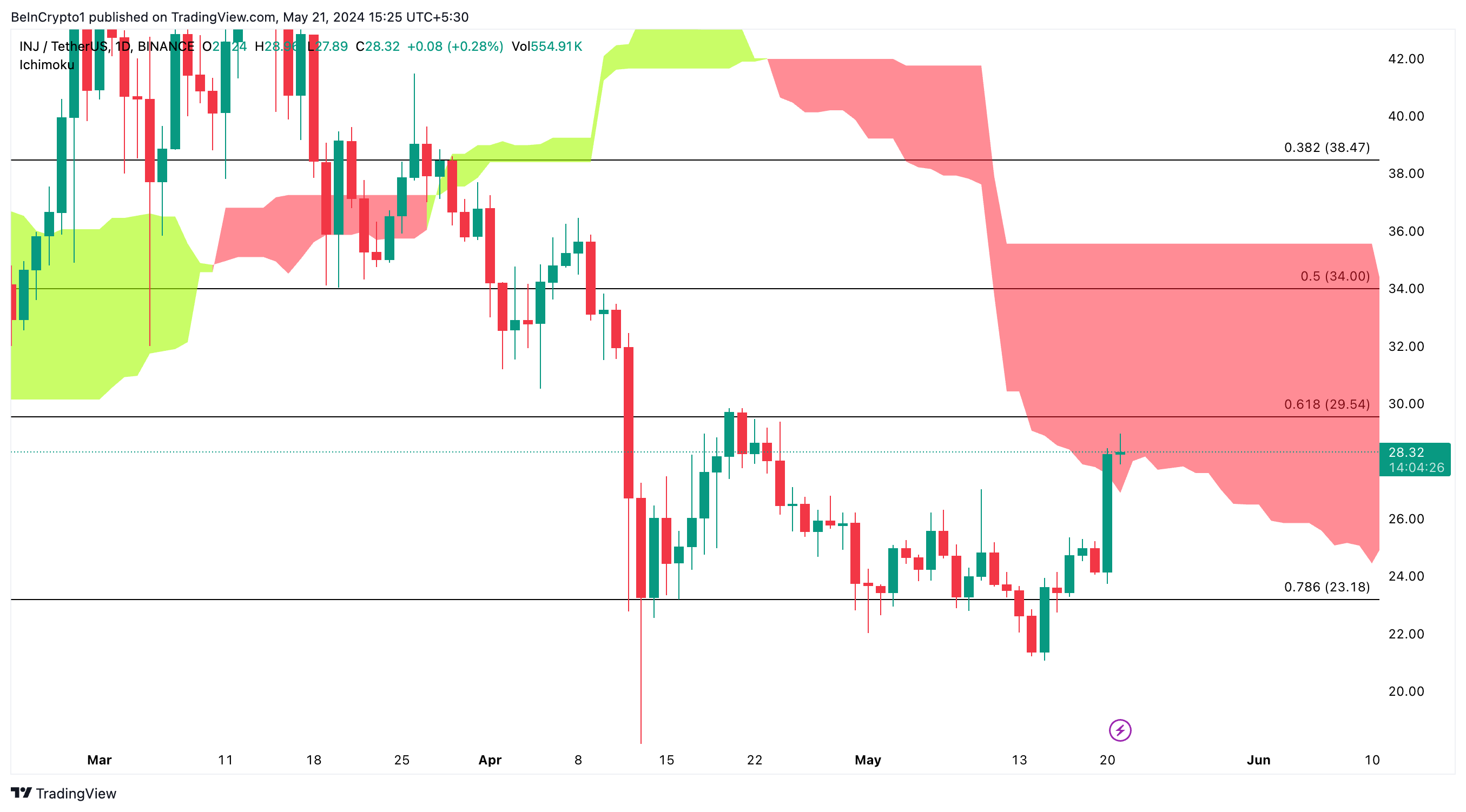 Die wichtigsten Widerstandsniveaus auf mittlere bis lange Sicht sind 29,5 USD, 34 USD, 38,4 USD und 43 USD. Wenn die tägliche Ichimoku Wolke auf INJ bricht, könnte es zu einem Preisanstieg in Richtung 33 USD kommen. Wenn der Bitcoin Kurs auf 73.000 USD zurückgeht, könnte der Preis mittelfristig leicht um weitere 18 Prozent steigen.