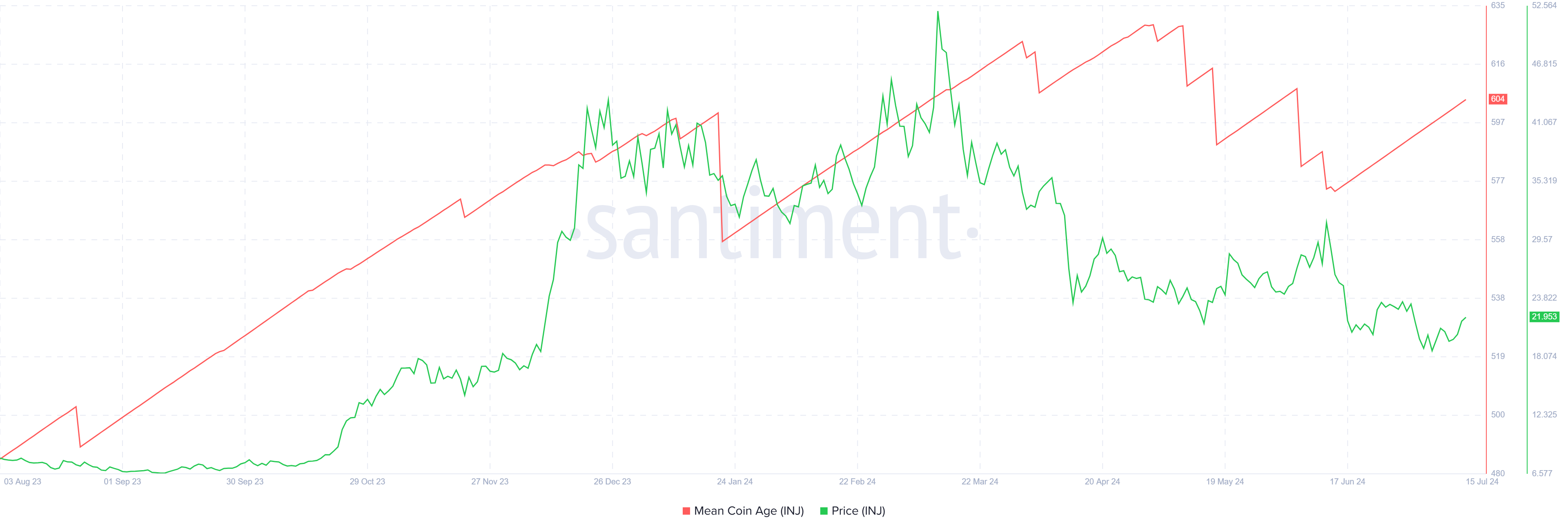 Die Überzeugung der INJ-Besitzer, möglicherweise auch der Wale, ist ein positives Zeichen für den Coin. Das zeigt sich im Anstieg des Durchschnittsalters der Coins, das seit Mitte Juni stetig zunimmt.