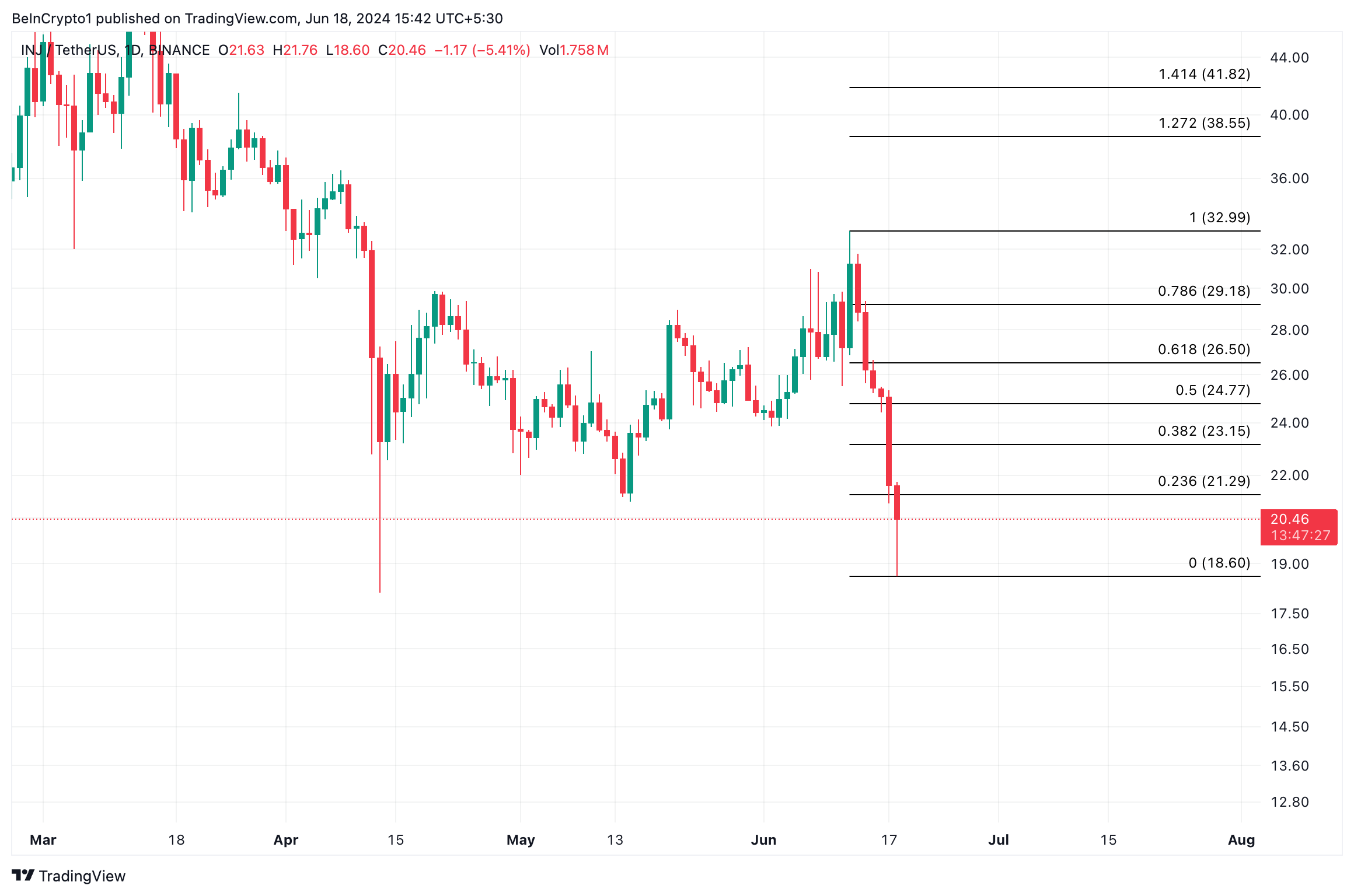 Der Injective (INJ) Kurs fällt in sieben Tagen um über 30 Prozent und verzeichnet mit 20,55 USD den niedrigsten Stand seit dem 11. Dezember 2023.