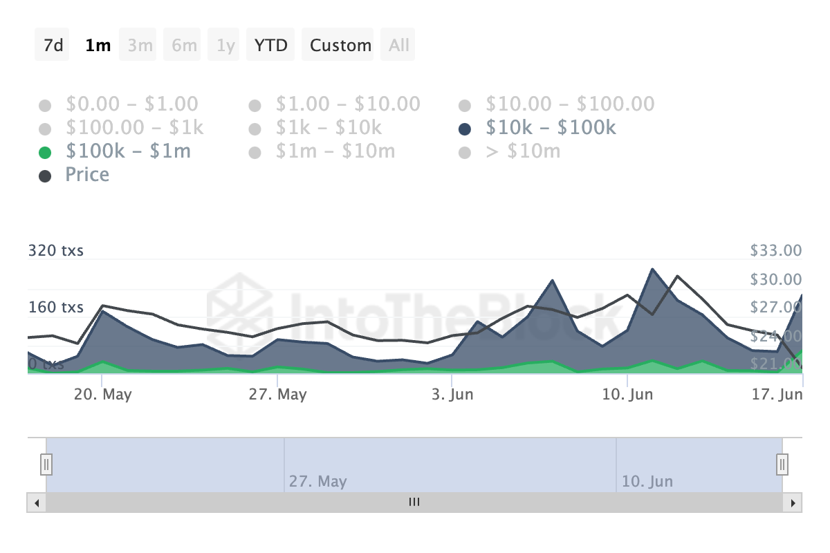 Zusätzlich hat INJ einen Anstieg seines täglichen Volumens an großen Transaktionen erlebt. Allein im letzten Monat ist die Anzahl der INJ-Transaktionen im Wert zwischen 100.000 und 1 Million USD um 1500 Prozent gestiegen.