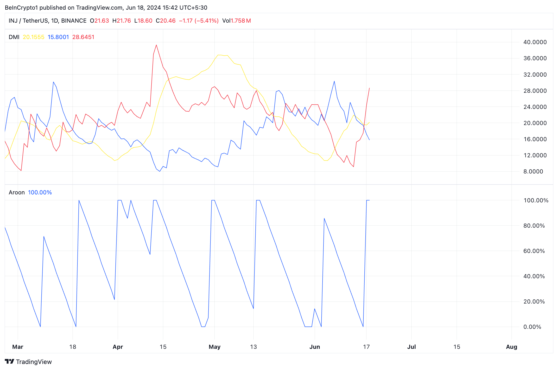 Die Aroon-Abwärtslinie von INJ bei 100 Prozent bestätigt die Stärke des aktuellen Abwärtstrends. Der Aroon-Indikator einer Anlage misst deren Trendstärke und potenzielle Preisumkehrpunkte.