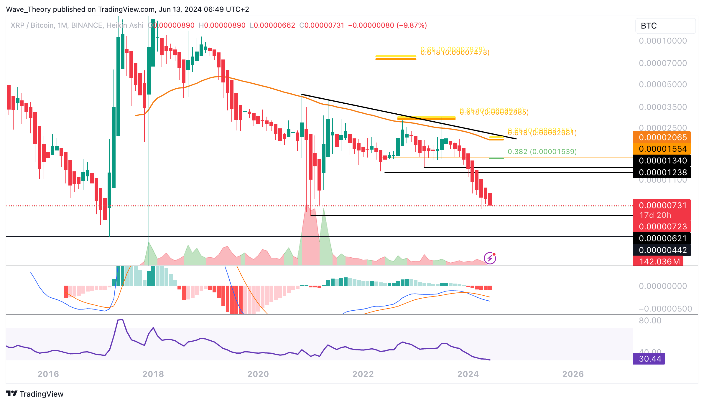 Gegen BTC befindet sich der Ripple Kurs in einem starken Abwärtstrend. Somit könnte der Ripple Kurs bald die Unterstützung bei rund 0,0000062 BTC erreichen.