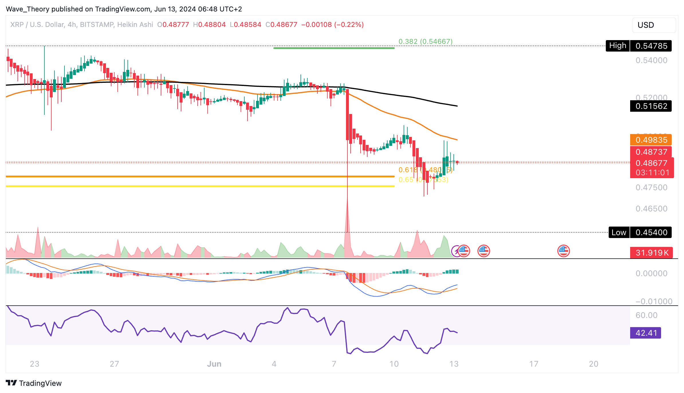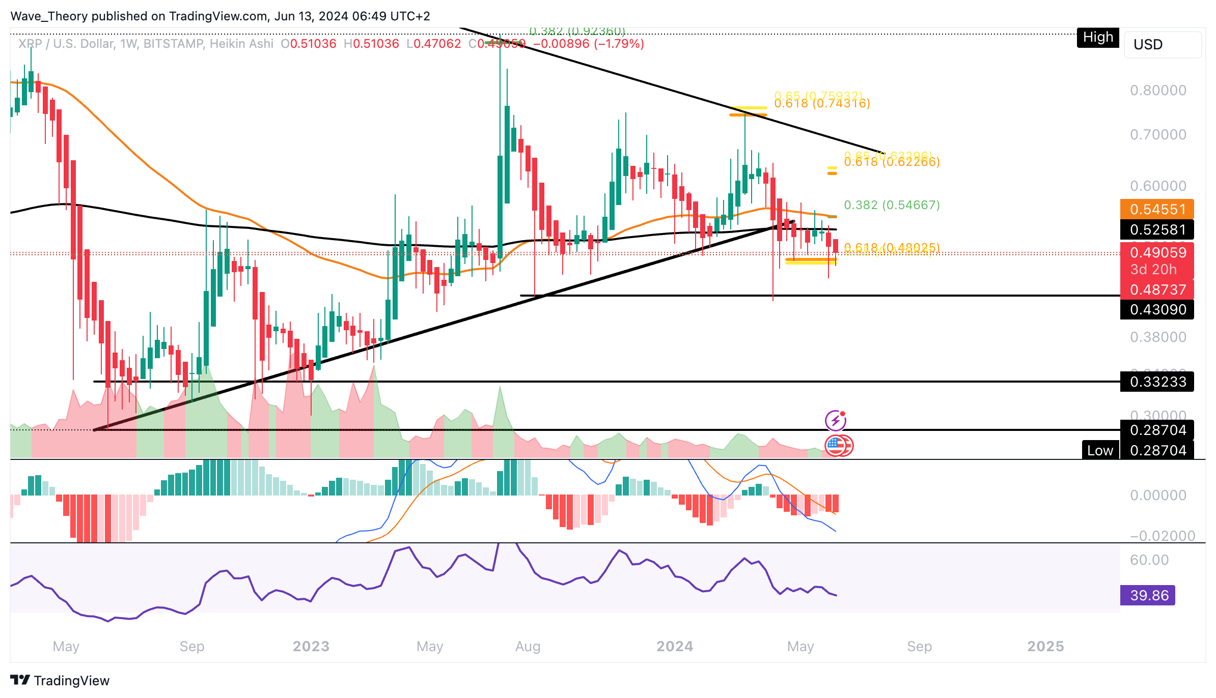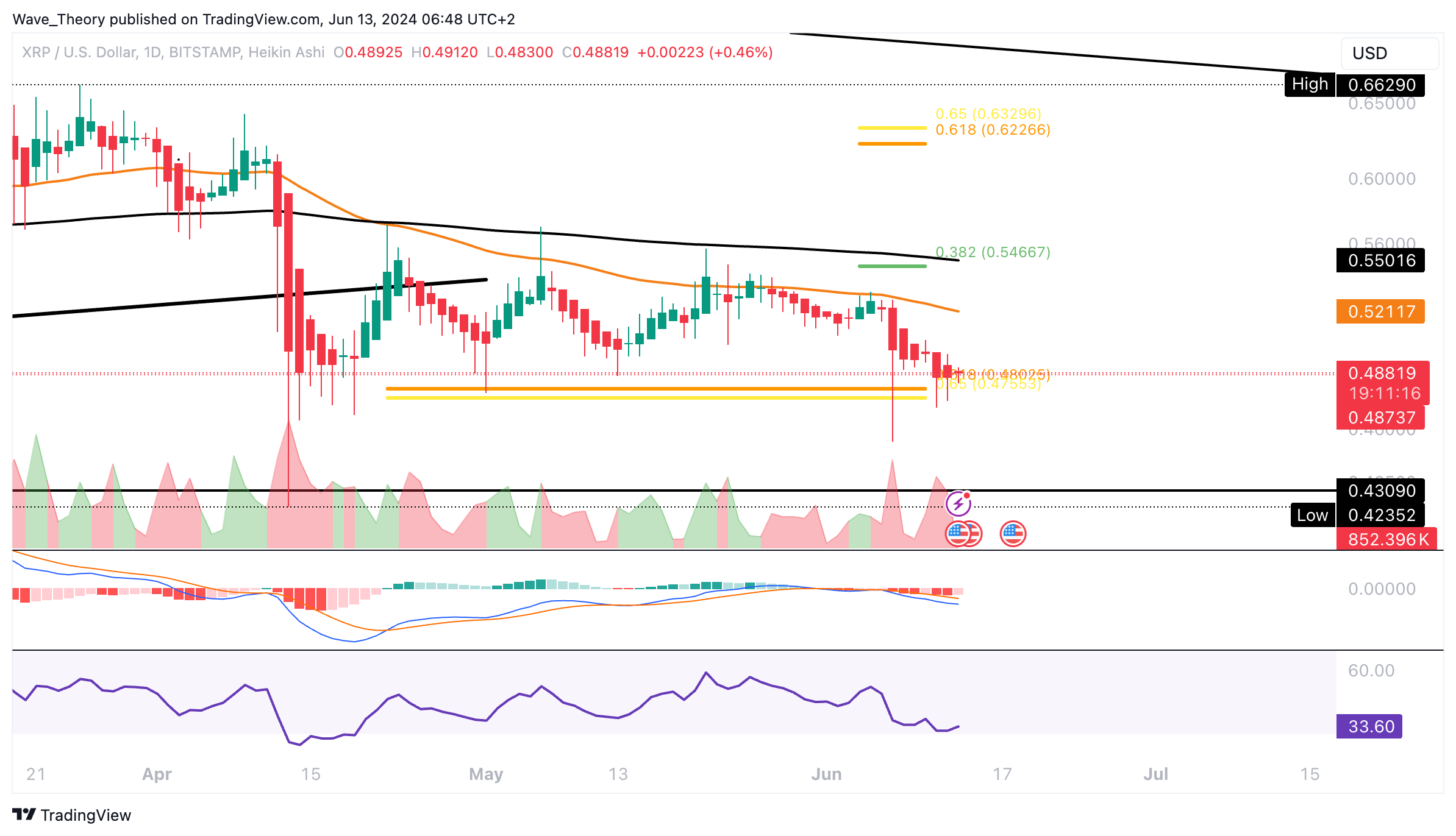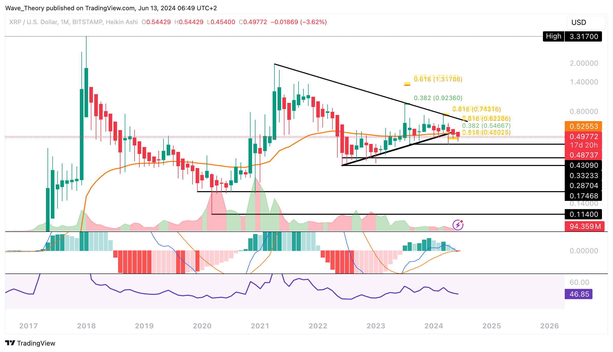 Der RSI bewegt sich währenddessen in neutralem Gebiet. Tatsächlich sieht es eher bärisch für den Ripple Kurs aus, insbesondere wenn der Kurs jetzt die Golden Ratio bei rund 0,48 USD bärisch bricht.