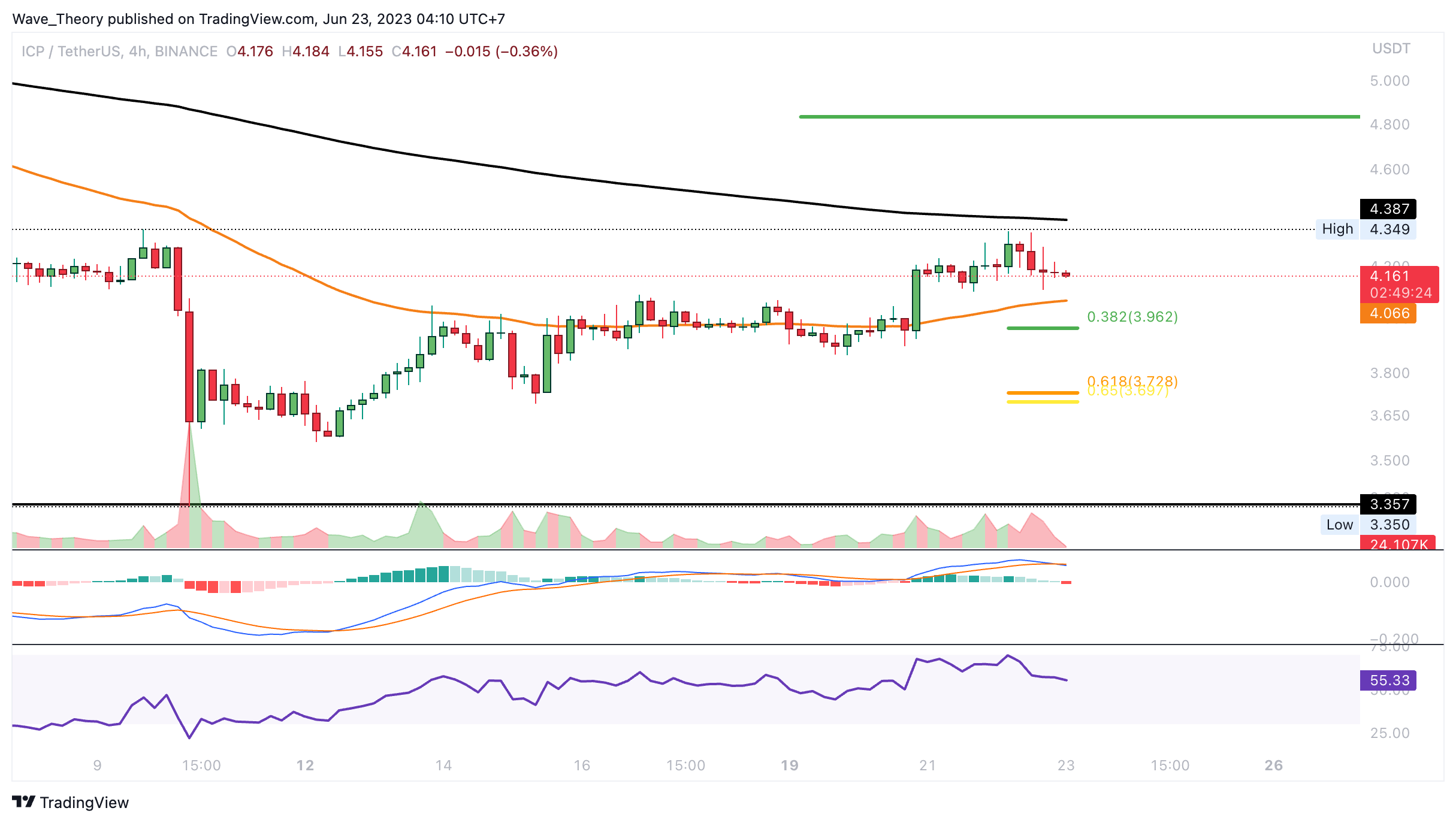 Auch im 4H-Chart ist das Death Cross der EMAs aktiv, womit der Trend kurzfristig bärisch bestätigt ist. Zudem überkreuzten sich die MACD Linien bärisch und das Histogramm des MACDs tickt bärisch tiefer. Wenn der ICP Kurs jetzt korrigiert, warten bereits bei rund 3,96 USD und bei rund 3,7 USD die nächsten signifikanten Fib Unterstützungen.