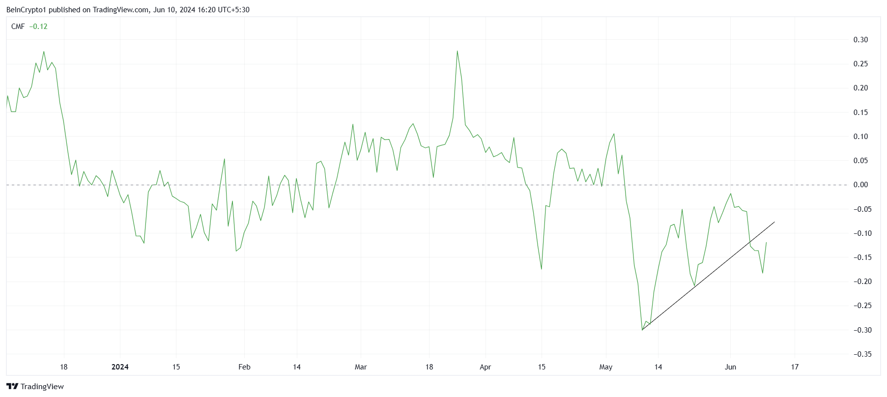 Der Chaikin Money Flow (CMF)-Indikator zeigt diesen Wandel durch seinen Abwärtstrend unterhalb der Aufwärtstrendlinie. Der CMF-Indikator misst die Akkumulation und Verteilung eines Vermögenswerts über einen bestimmten Zeitraum, indem er sowohl Preis als auch Volumen verwendet, um Kauf- und Verkaufsdruck zu messen.