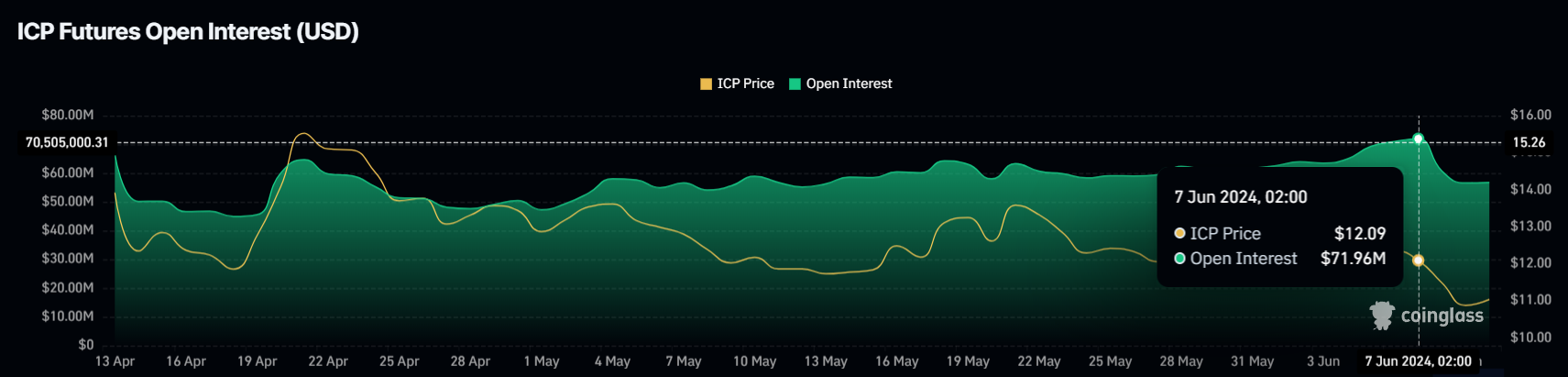 Es gibt Einblick in die Liquidität des Marktes und die Stärke der Preistrends, wobei steigendes offenes Interesse oft auf eine zunehmende Marktbeteiligung hinweist. Seitdem ist das offene Interesse bei ICP jedoch um 15 Millionen USD in nur drei Tagen gefallen.