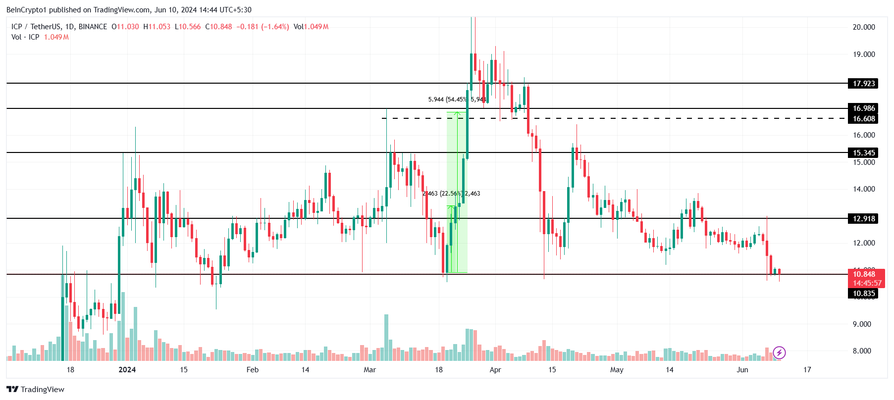 Der ICP-Kurs, der bei 10,84 USD gehandelt wird, testet die kritische Unterstützung von 10,83 USD. Diese Unterstützungsebene wurde seit Januar dieses Jahres trotz fünf Versuchen nicht durchbrochen. Ein Rückgang darunter würde ein Sechs-Monats-Tief für das Krypto-Asset markieren.