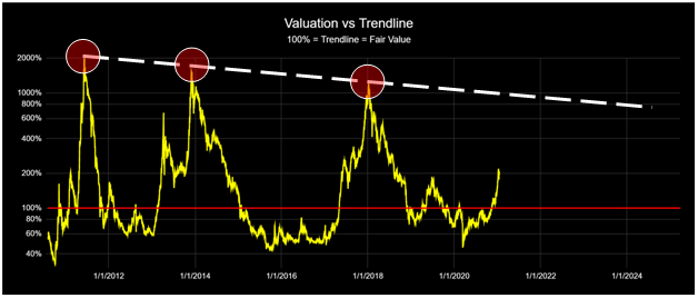 Ich denke, dass eine einzige mathematische Gleichung zur Beschreibung der gesamten Kryptowährungs-Asset-Klasse poetisch ist. Die Tatsache, dass der Kurs der Makro-Level-Trendlinie folgt, mit der man die Preisspitzen ziemlich gut vorhersagen kann, ist allerdings nicht ohne.