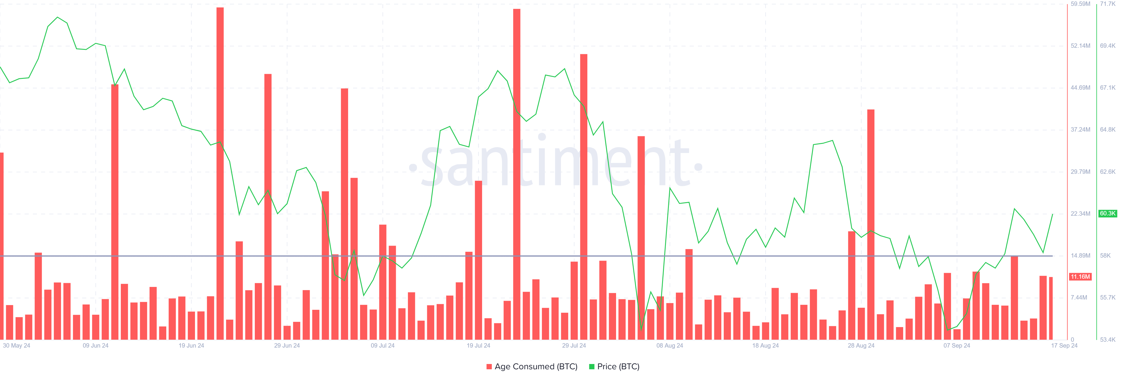 Im Hinblick auf das makroökonomische Momentum spielt die Metrik „Age Consumed“ eine bedeutende Rolle bei der Bewertung der Aktionen langfristiger Halter. Diese Metrik misst, wie die Bewegung oder der Verkauf älterer BTC den Markt beeinflusst.