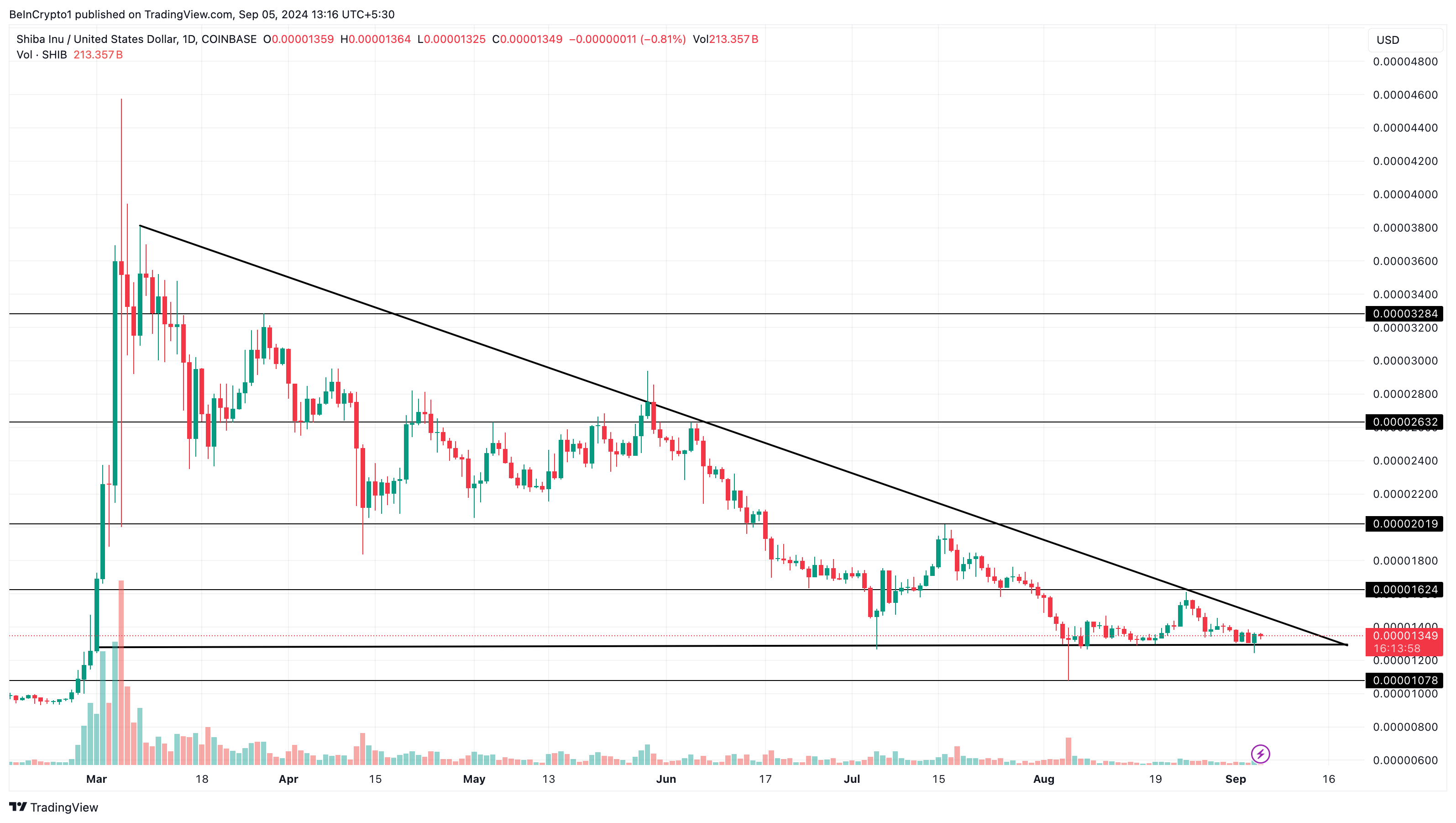 Das Tagesdiagramm von SHIB zeigt, dass der Coin seit sechs Monaten in einem Abwärtstrend ist. Doch diese unschöne Realität könnte bald enden. Obwohl ein schneller Aufwärtstrend kurzfristig unwahrscheinlich scheint, ist es unwahrscheinlich, dass SHIB erneut stürzt, wie es in der ersten Augustwoche der Fall war.