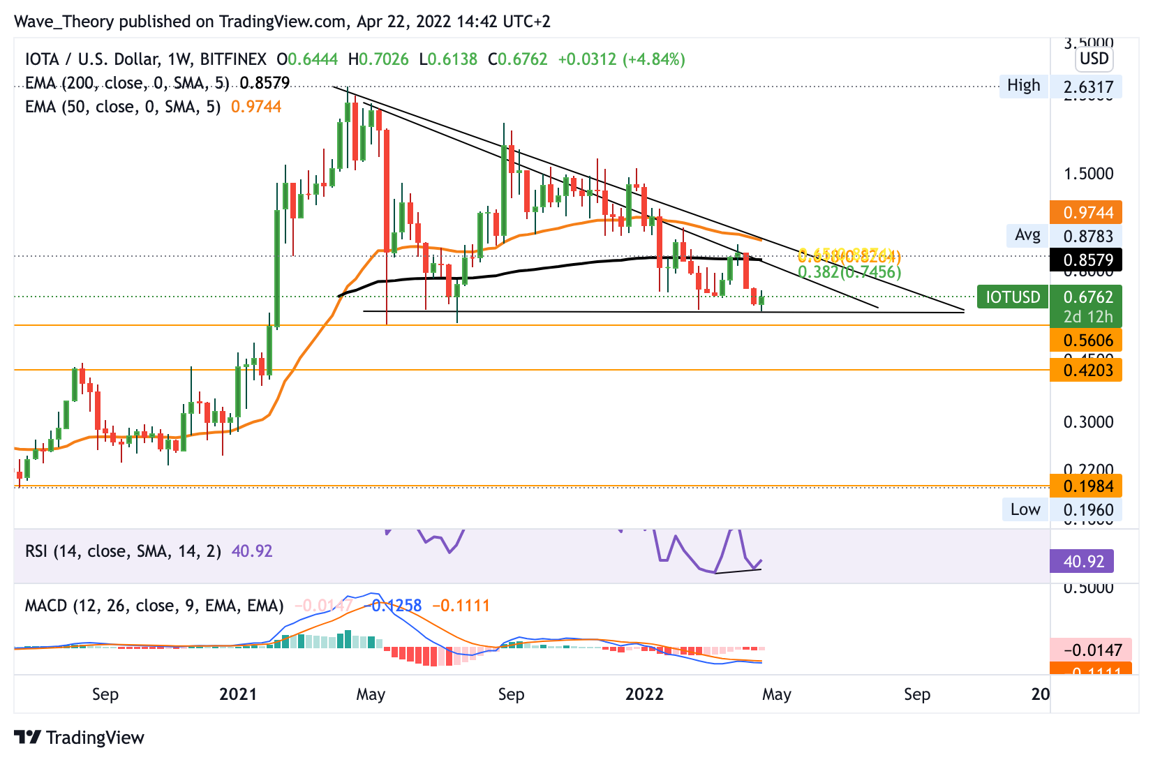 Der Wochenchart zeigt sich im Gegensatz zum Monatschart deutlich bullischer. Zum einen liegt ein bullisches Golden Crossover vor, denn die EMAs sind noch immer bullisch überkreuzt. Zum anderen zeichnet sich eine kleine bullische Divergenz im RSI ab, woraufhin IOTA jetzt steigen könnte. Bei rund 0,75 USD und 0,83 USD warten dann die nächsten signifikanten Fibonacci Widerstände auf IOTA. Sollte IOTA die Golden Ratio bei 0,83 USD brechen, hätte IOTA eine Chance auf einen höheren Hochpunkt, die der Abwärtsbewegung ein Ende setzen könnte. Denn seit Mai 2021 formte der IOTA Kurs konsequent tiefere Hochpunkte und prallte dabei mehrfach an der Trendlinie des absteigenden Dreiecks ab, bei rund 0,56 USD.