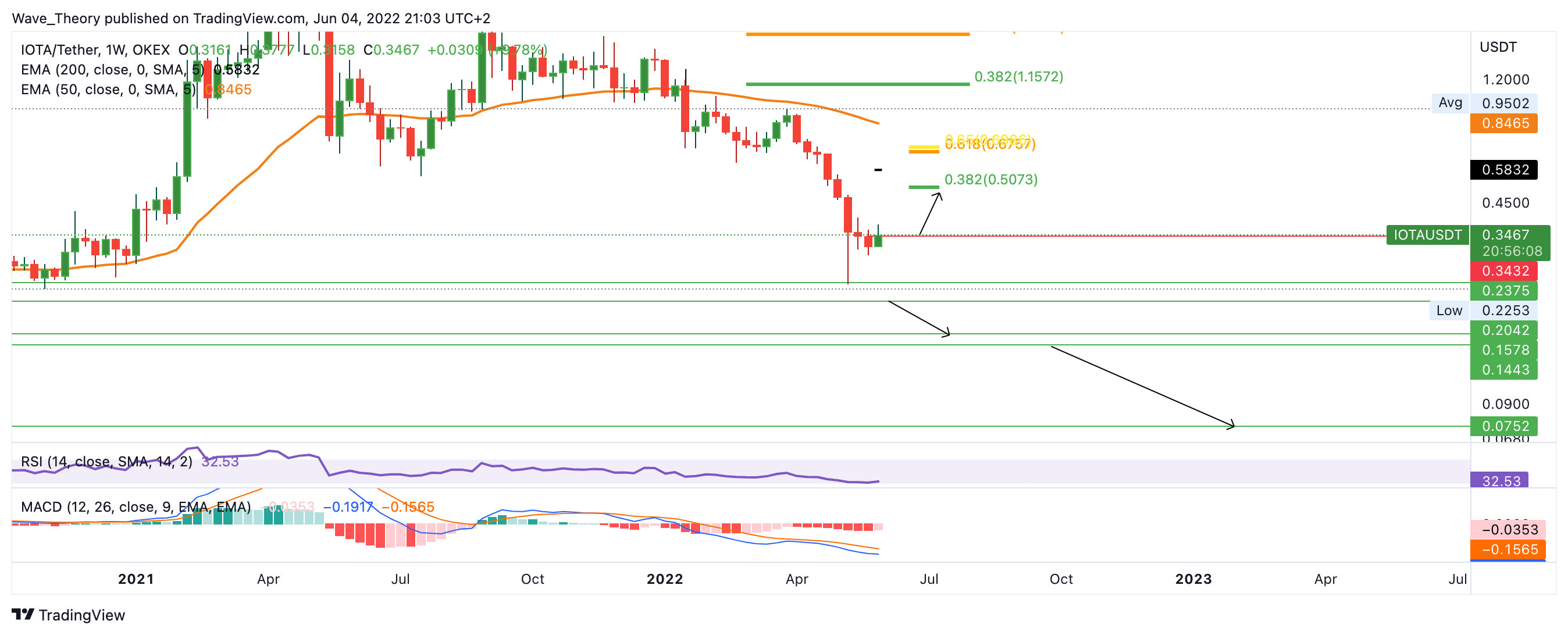 Sollte IOTA an einer der Fib Widerstände auf bärische Ablehnung stoßen und zur Unterstützung bei rund 0,4 USD zurückkehren und diese bärisch brechen, dann könnte IOTA auf 0,14 – 1,16 USD korrigieren.