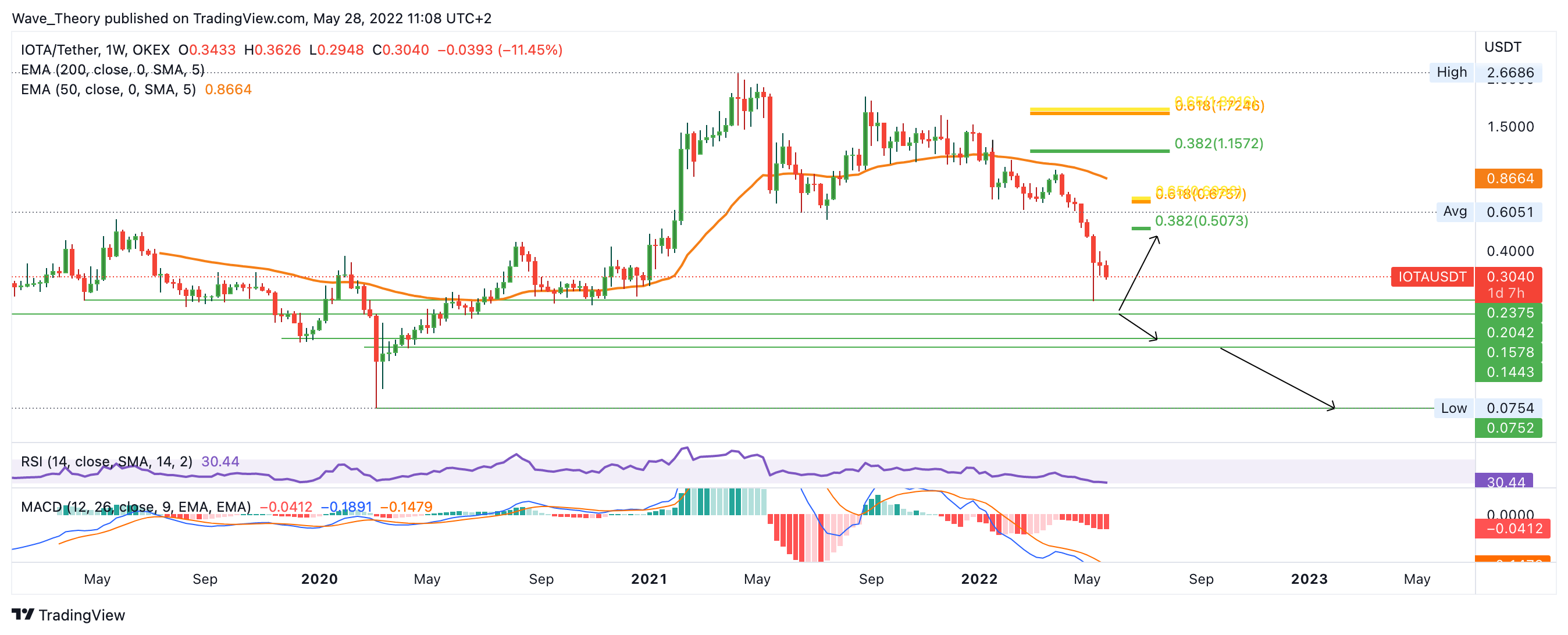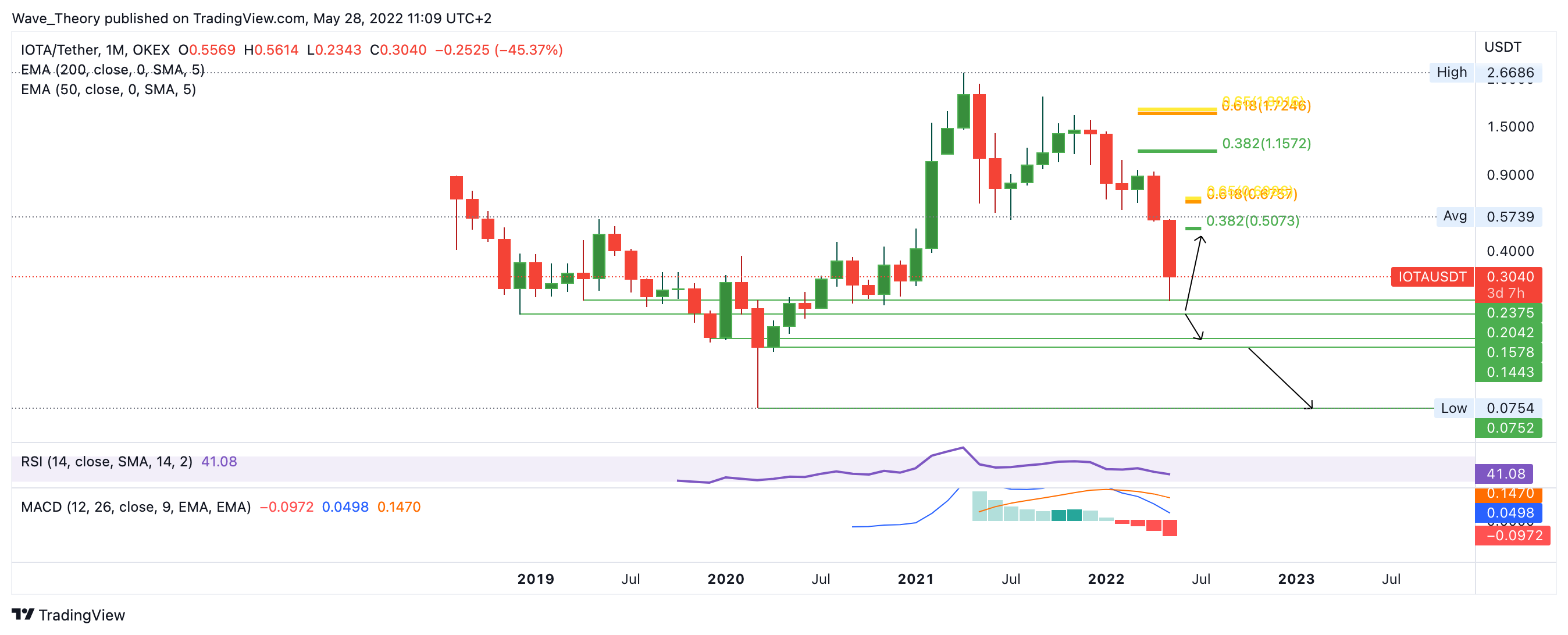 Sollte IOTA die Unterstützung zwischen 0,2 -0,24 USD bärisch durchbrechen, könnte er auf rund 0,15 USD zurückfallen. Bricht IOTA auch diese Unterstützung, wartet erst wieder am Tiefpunkt aus 2020 signifikante Unterstützung auf IOTA.