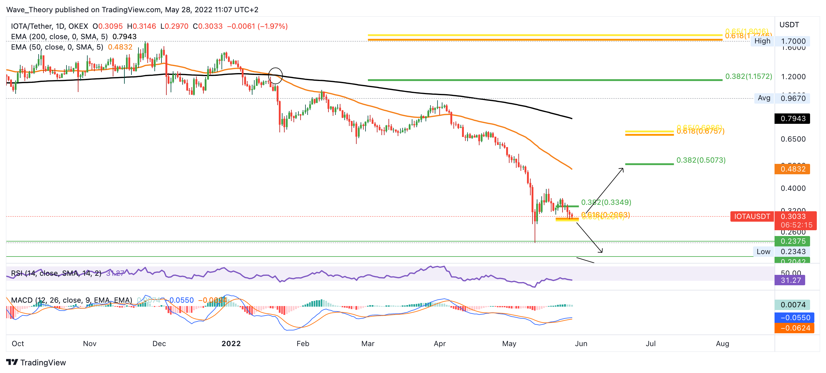 Im bullischen Szenario könnte IOTA aber erneut an der Unterstützung zwischen 0,2 – 0,24 USD abprallen, um die Fibonacci Widerstände bei rund 0,5 USD und 0,7 USD zu erreichen.