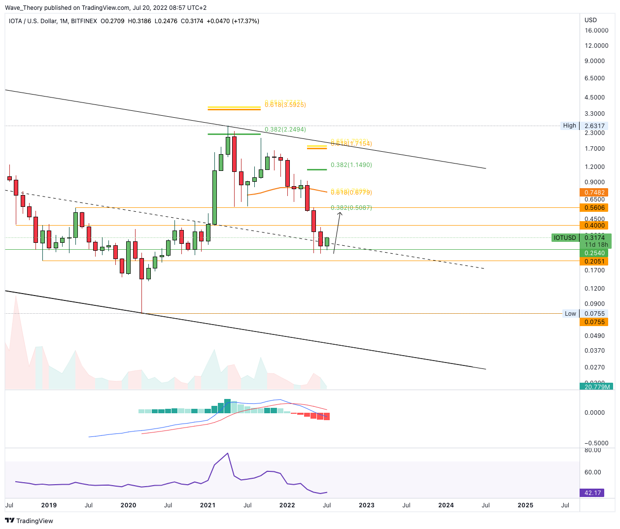 Sollte der IOTA Kurs die Golden Ratio bei rund 0,33 USD bullisch brechen, könnte der IOTA Kurs mittelfristig sogar bis zum 0,382 Fib Niveau bei rund 0,5 USD steigen.