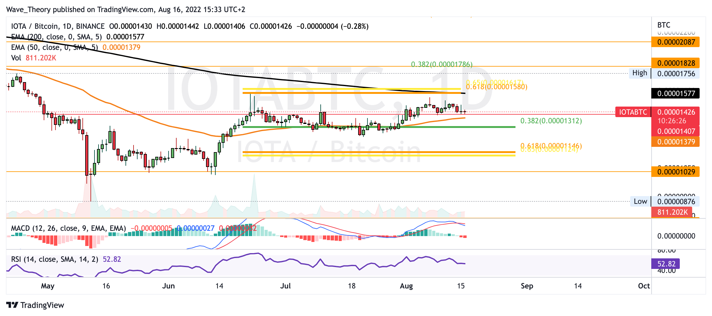 Aktuell zeigt sich der MACD im Tageschart aber bärisch, während sich der RSI neutral zeigt. Damit könnte IOTA kurzfristig zum 50-Tage-EMA bei rund 0,0000138 BTC korrigieren, oder gar bis zum 0,382 Fib Niveau bei rund 0,00001312 BTC.