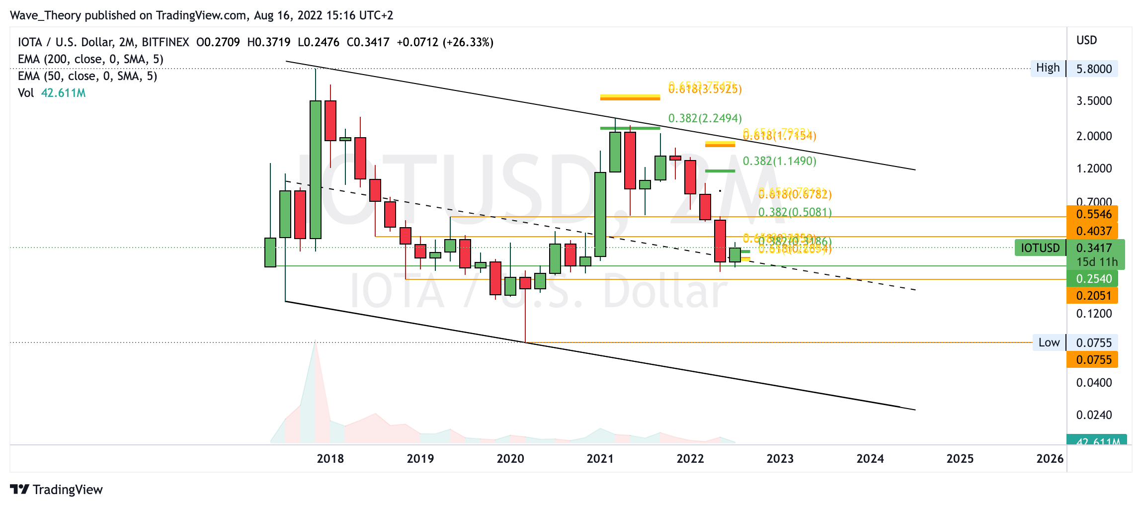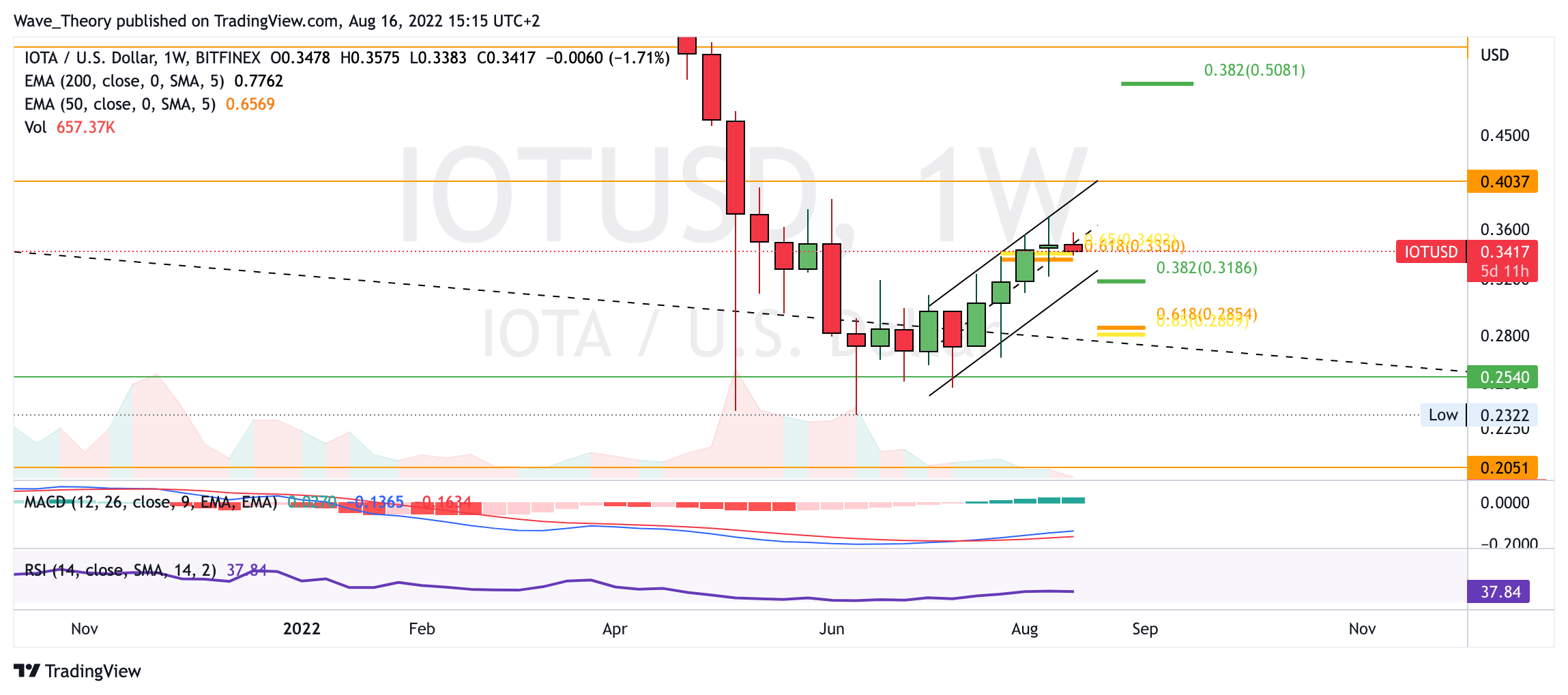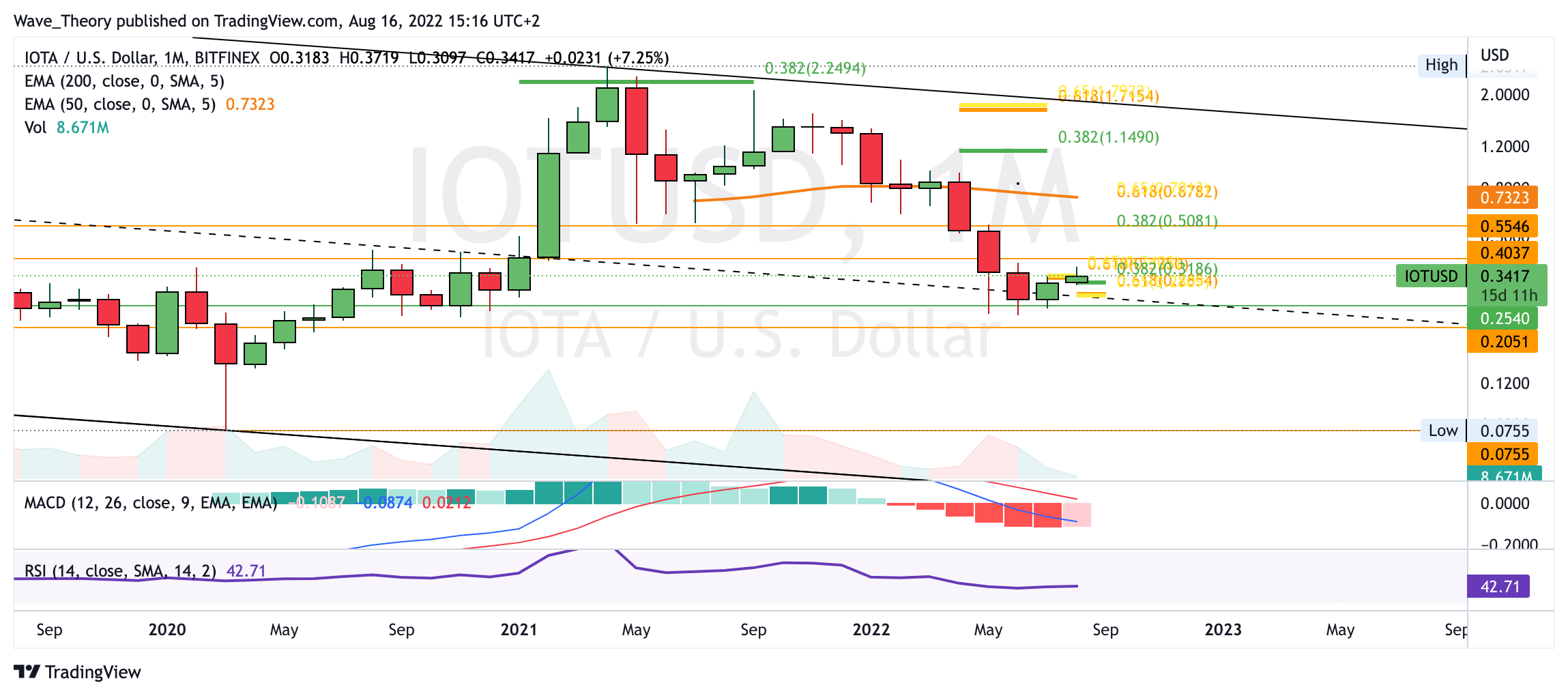 Zudem tickt nun auch das Histogramm des MACDs im Monatschart bullisch höher, was Hinweise auf eine bullische Trendumkehr gibt. Mittelfristig könnte der IOTA Kurs bis zum 0,382 Fib Niveau bei rund 0,51 USD steigen oder gar bis zum 50-Monate-EMA bei rund 0,73 USD.