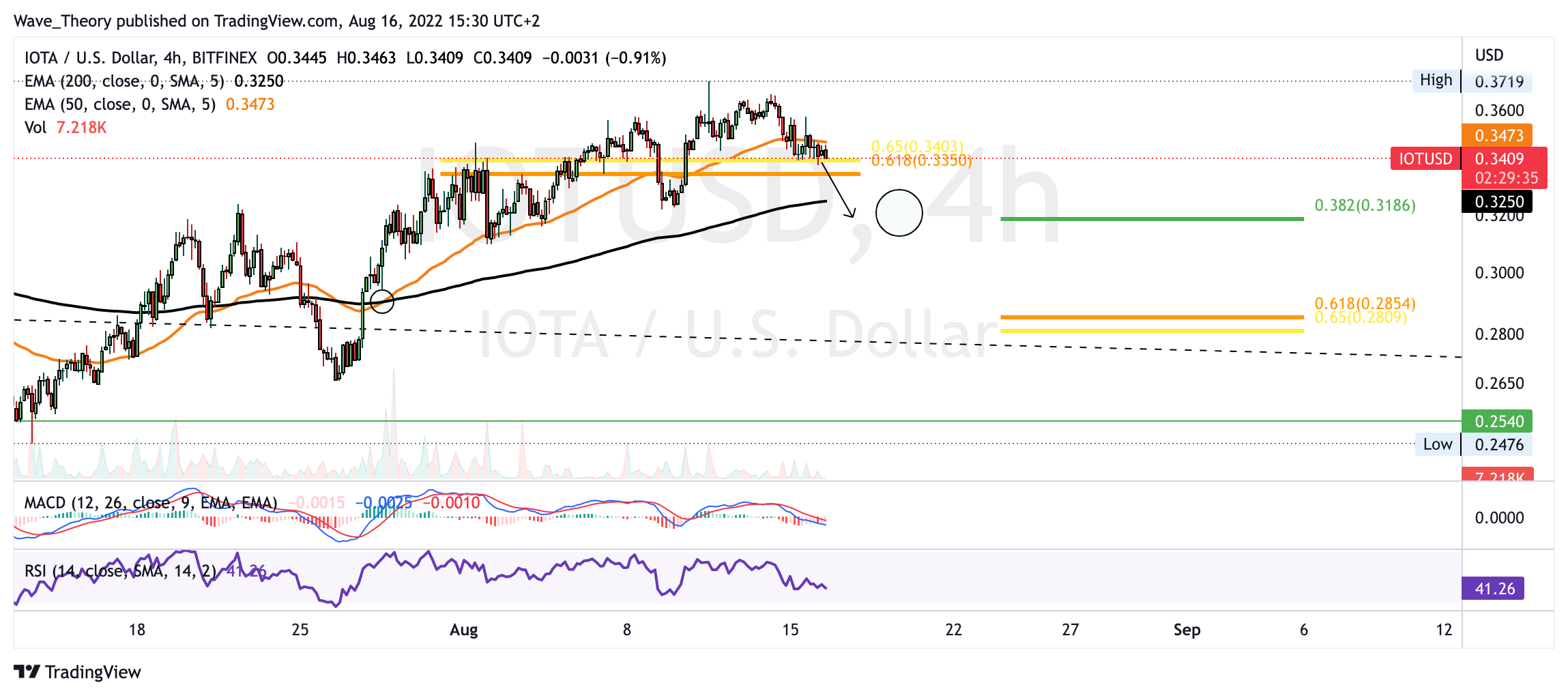Kurzfristig könnte sich der IOTA Kurs also auf rund 0,32 USD zurückbewegen und sollte diese Unterstützung brechen, findet IOTA spätestens bei rund 0,28 USD signifikante Fibonacci Unterstützung. Zudem zeigt sich der MACD auch im 4H Chart bärisch.