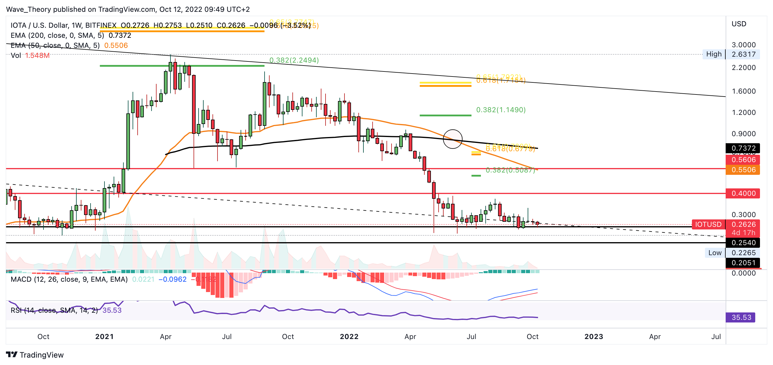 Jedoch fehlt jegliches bullisches Momentum. So wurde IOTA konsequent an allen Fib Widerständen abgewiesen und es gelang IOTA nie, bullisch auszubrechen. Zudem befindet sich IOTA nach wie vor seit 2018 in einem parallelen Abwärtskanal und damit in einem starken Abwärtstrend.