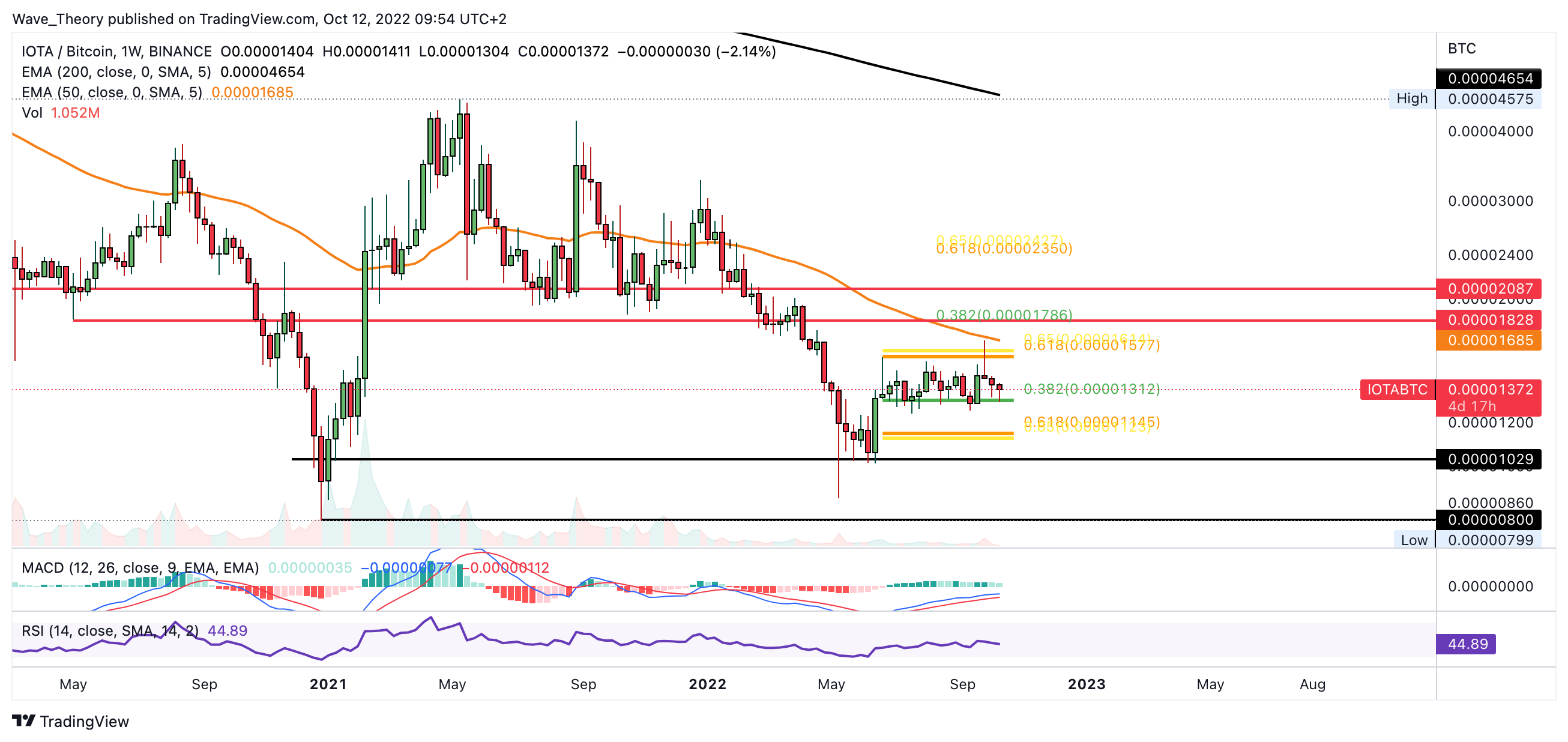 Gegen BTC rangiert IOTA zwischen zwei Fib Niveaus