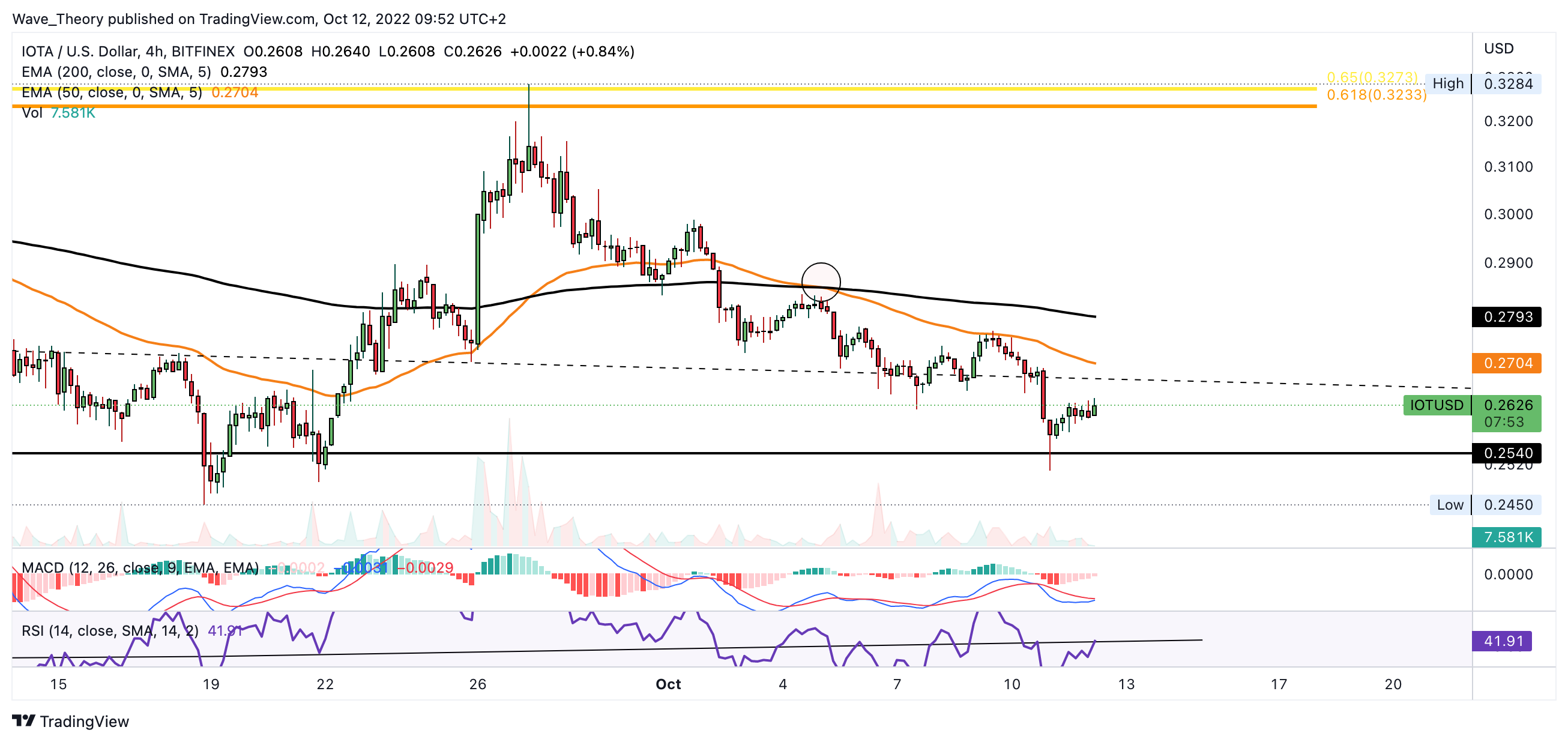 In der letzten IOTA Kurs Prognose schrieben wir: “Der IOTA Kurs kehrte zur Unterstützung zwischen 0,2 USD und 0,254 USD zurück und konnte daraufhin einige Tage steigen. Anschließend erreichte der IOTA Kurs den Golden Ratio Widerstand bei rund 0,33 USD, woran IOTA stark bärisch abgewiesen wurde. Dabei stößt IOTA jetzt am 50-Tage-EMA bei rund 0,289 USD und an der Golden Ratio bei rund 0,275 USD auf signifikante Unterstützung.