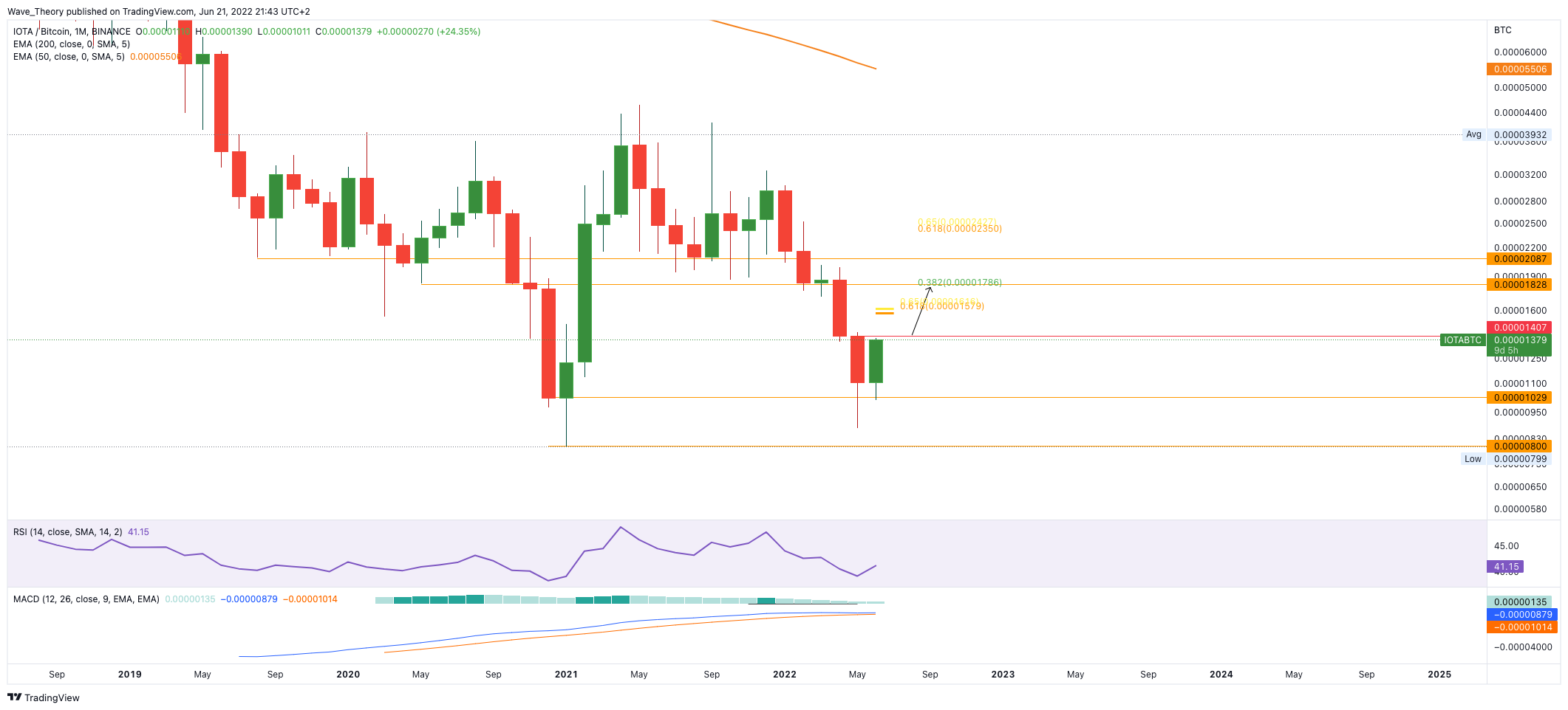 Im Gegensatz dazu zeigt sich IOTA im Monatscharts gegen BTC äußerst bullisch, denn hier könnte die Monatskerze eine “Bullish-Engulfing-Candle” formen; eine bullische Kerzenformation. Dafür müsste der IOTA Kurs zum ersten des neuen Monats über 0,00001407 BTC stehen. Dann könnte IOTA im neuen Monats bis zum 0,382 Fib Niveau bei rund 0,0000179 BTC steigen.