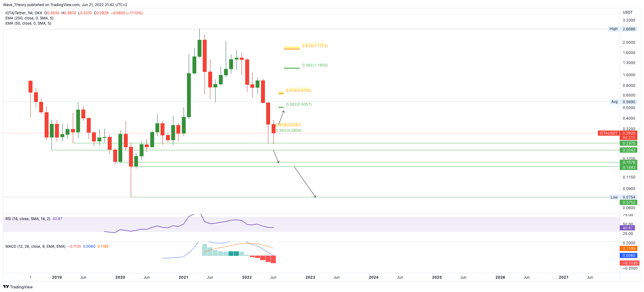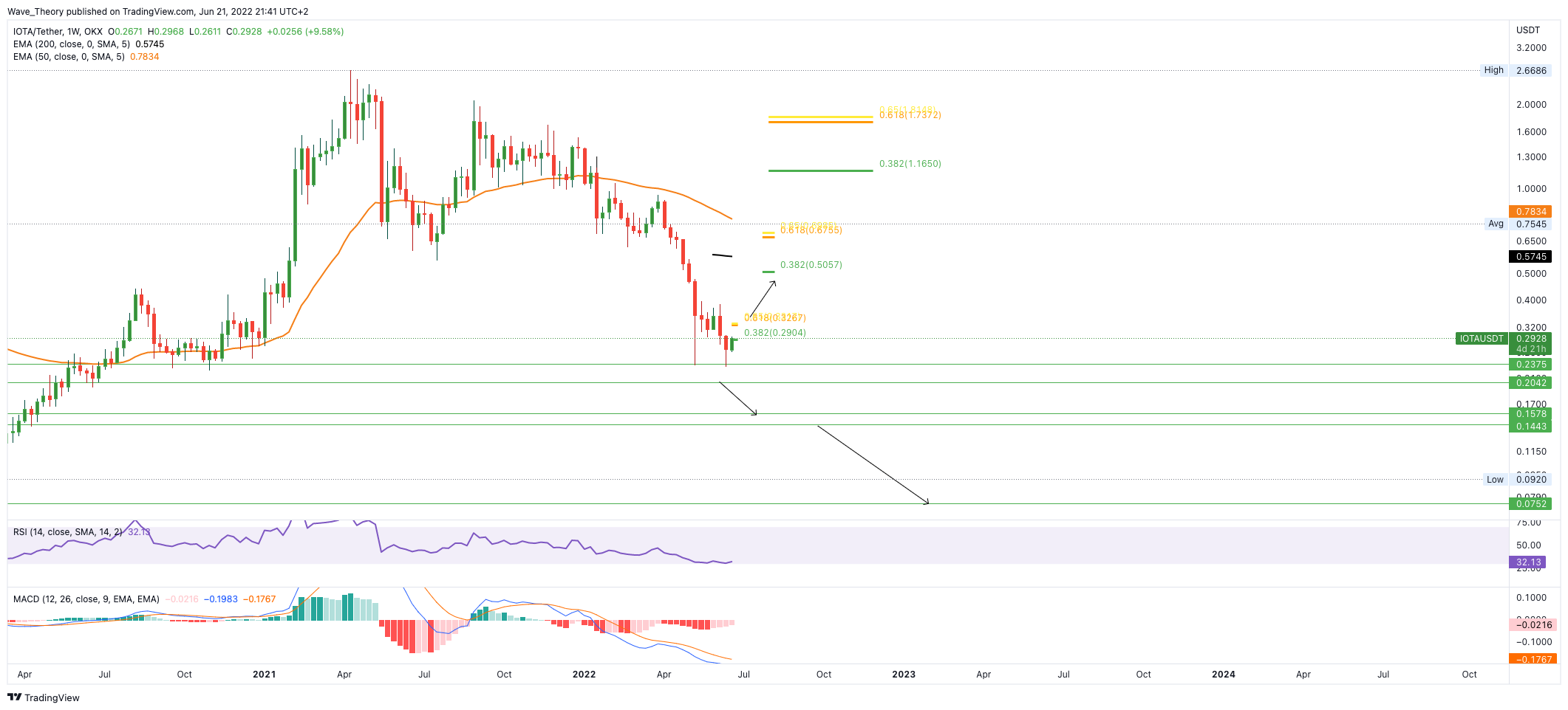 Jedoch tickt das Histogramm des MACDs auch im Wochenchart bullisch höher. Sollte IOTA jetzt beide Fibonacci Widerstände bei 0,29 USD und 0,33 USD brechen, könnte IOTA sogar bis zum nächsten Fibonacci Widerstand bei rund 0,5 USD steigen. Bricht IOTA auch diesen Widerstand, wartet bei rund 0,7 USD der nächste Fibonacci Widerstand.